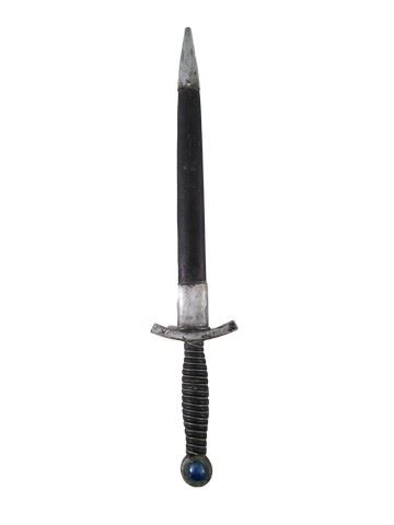 Screen used, production distressed Death Dealer dagger with irremovable sheath. The dagger handle has black grip with a silver colored lacing. The bottom of the handle has a round blue gem. Gem is not real. Item may slightly vary from picture. (approx. 19" x 4")