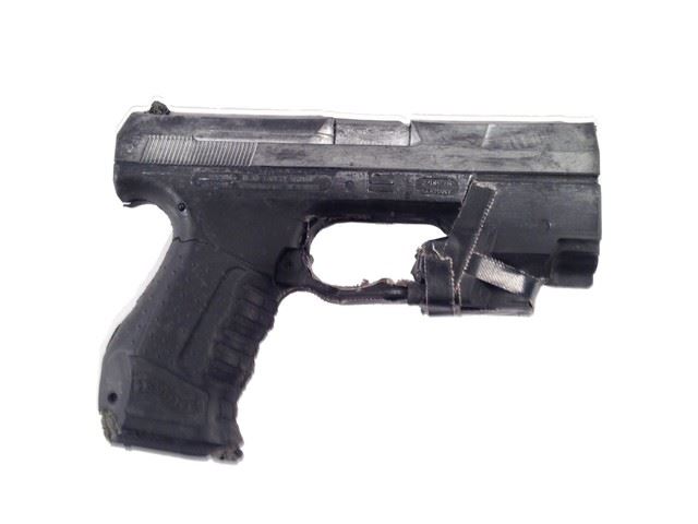Selene's (Kate Beckinsale) screen used, distressed, foam silver and black Walther P99 pistol. Missing trigger, iron sight, and front sight. Trigger guard held by tape. Used in Underworld: Evolution. (Approx. 7 1/4" x 5")