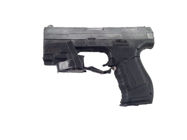 Selene's (Kate Beckinsale) screen used, distressed, foam silver and black Walther P99 pistol. Missing trigger and iron sight. Trigger guard torn. Used in Underworld: Evolution. (Approx. 7 1/4" x 5")