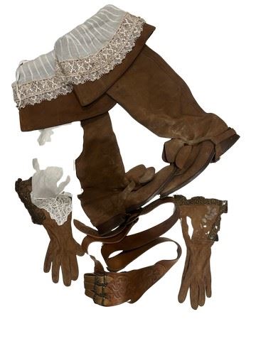 Johan De Bye (Kevin McKidd) screen worn, tan suede, tall, custom made riding boots (approximate size 41), linen rectangle scarf with white lace on the edge, two lace and linen boot tops sewn into the boots, a linen collar trimmed with lace, pale cream, plain, gauntlets/ gloves and tan, suede gloves with fancy gold braid and trim. Includes a costume department wardrobe continuity page.