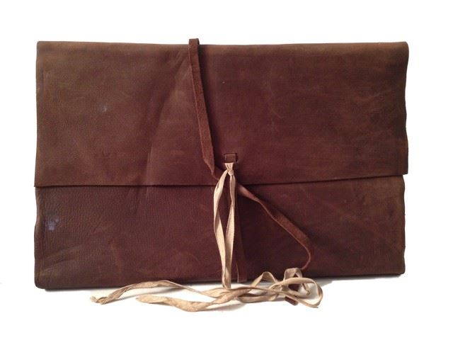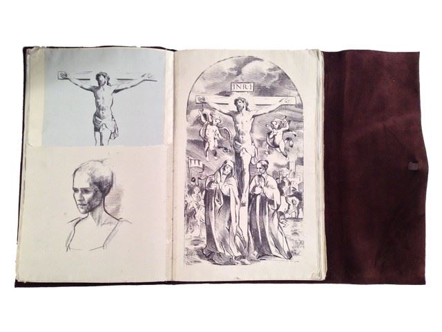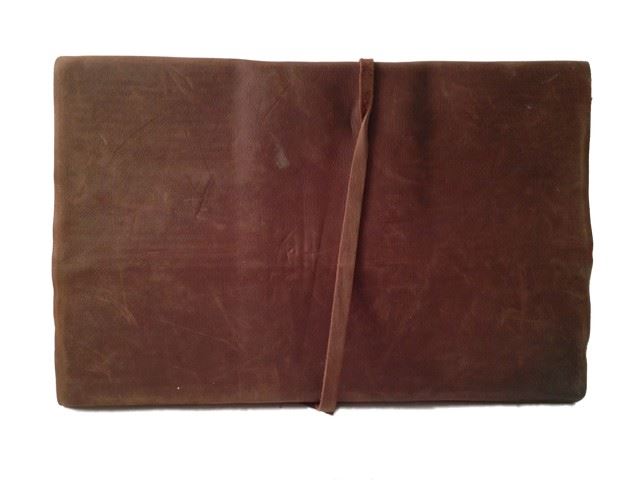 Jan Van Loos (Dane De Haan), screen used, hero, brown leather sketchbook with two loose sketches of Sophia (Alicia Vikander), as well as a couple of sketches of the crucifixion, on heavy parchment type paper. A majority of the pages are blank. (17"x12"x1").