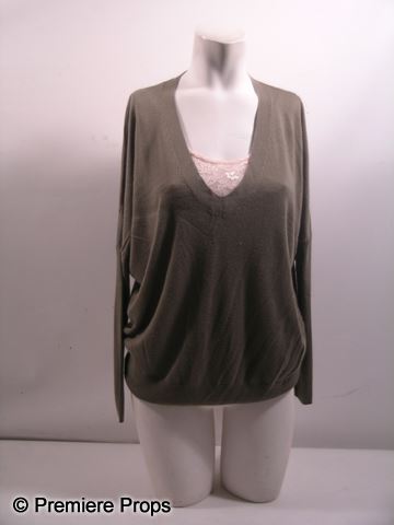 Stephanie (Kyra Sedgwick) screen worn, hero, black and brown zip up the front jacket, olive v-neck cashmere 'Community' sweater, (size XS) light pink with lace 'Talua' camisole, (size XS) multicolor scarf, medium blue was 'J. Brand' jeans, and tan suede and leather with wood heal boots. Includes wardrobe tag!