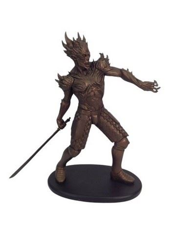 Sculpt: The maquette captures the final, demonic, armored form of Drake. The detail is complex, showing jagged horns, a skeletal face, and intricate, scaled armor plates across his body. He is posed mid-stride, holding a long katana-style sword. The statue has a unique, aged metallic finish (bronze or pewter color) that highlights all the sculpted textures.