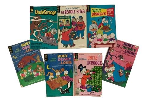 A collection of 7 Walt Disney comics. Uncle $crooge #193, 1981, #141, June 1977.Huey, Dewey, and Louie Junior Woodchucks #5, April 1970, #12 Jan. 1972, and #43, April 1977. The Beagle Boys #10, 1970. Comics and Stories Vol. 32 #3, December 1971. Condition: vintage, fair.