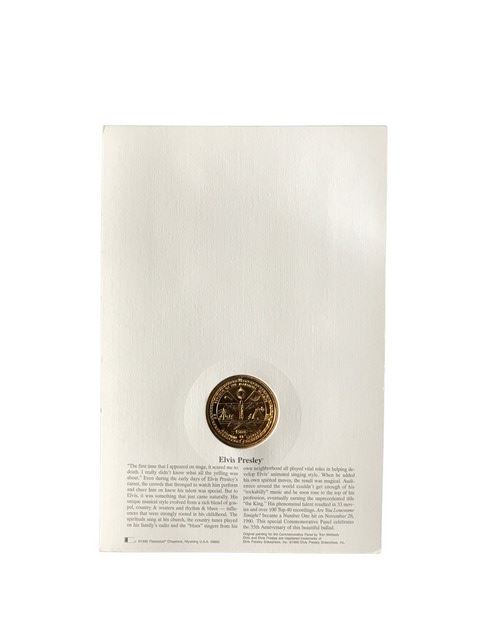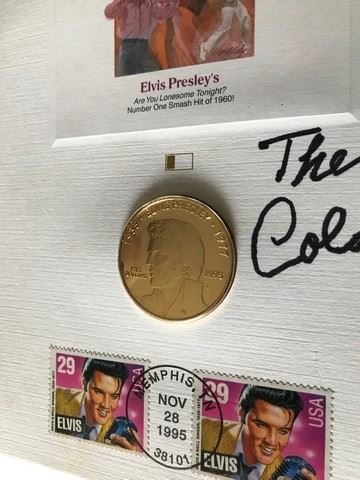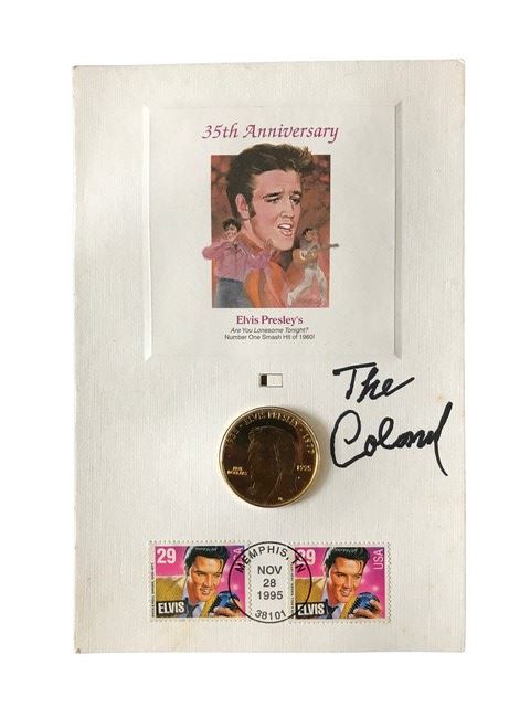 Colonel Tom Parker's autographed 35th anniversary, Memphis issue, Elvis Presley stamp and coin. The coin is based on the #1 smash hit of 1960 - Are You Lonesome Tonight? Postage meter stamp is dated 11/28/1995. From his personal collection.