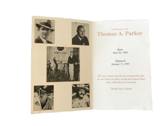 Colonel Tom Parker's memorial service program. Colonel was Elivs Presley's manager. He was know for shrew business acumen and his ability to promote Elvis as a globabl phenomenon. He managed his career from 1955 until Eliv's death in 1977. The memorial program cover page reads: In tribute to: “Our Colonel” memorial service Saturday, January 25, 1997, Las Vegas Hilton. Inside page has several photos of him in his life on the left. On the right it says in memory of Thomas A. Parker, born June 26, 1909, departed January 21, 1997. He was a man who lived a technicolor life in our black-and-white world and shared that color with those he touched. Thank you, Colonel.