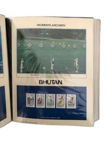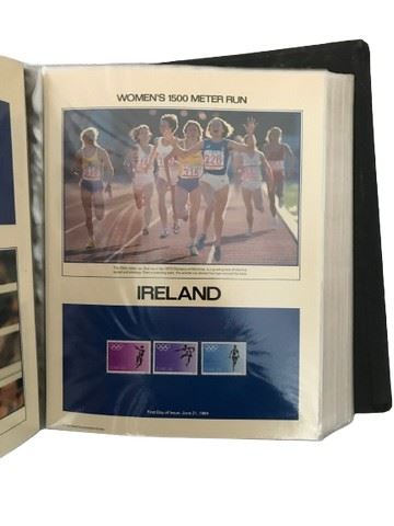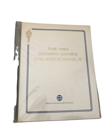 Postal Commemorative Society, 1984 Olympic Games Philatelic Panels. Includes original introductory page from the Commemorative Society, each panel details event and country of origin, covered in protective plastic sleeves. 90 total panels. Included a page for each country and their respective Olympic stamps. Each page is protected by plastic.