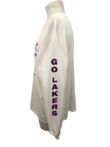 This holiday themed Los Angeles Lakers long-sleeved features an adorable Christmas wish-list on the obverse of the shirt, checking off "Another Championship", listed five times, with "Go Lakers" printed along the length of the left sleeve.This Gildan long-sleeve t-shirt is white with purple screen printing. Sized Extra Large.