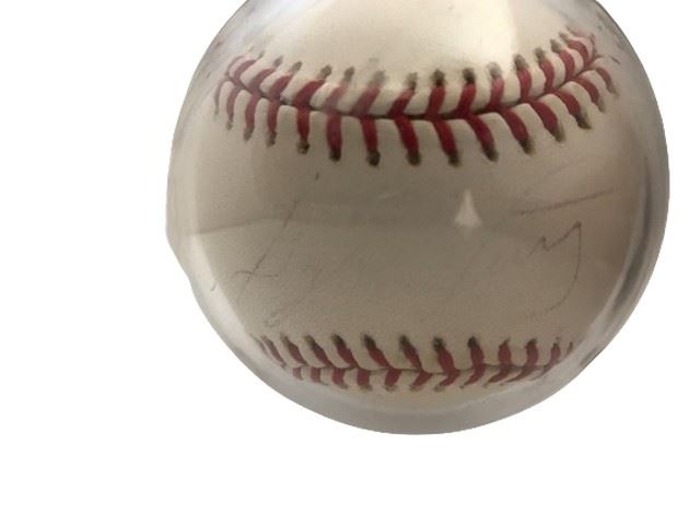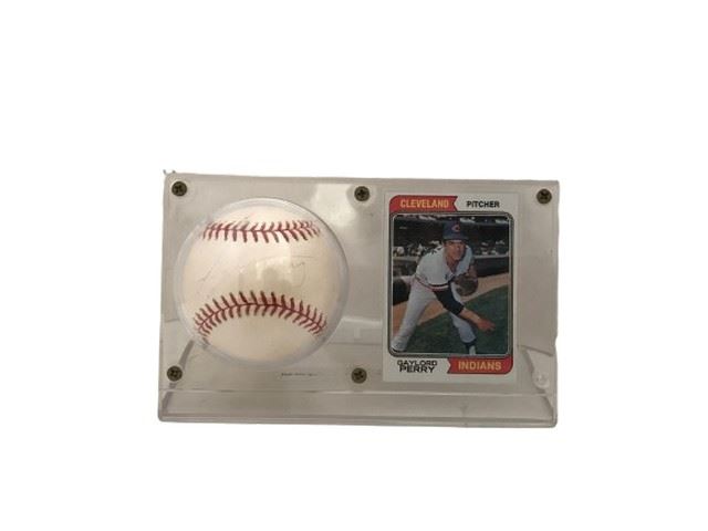 Signed Rawlings baseball by Cleveland Indian’s Gaylord Perry and Jackson trading card displayed in ultra pro acrylic case