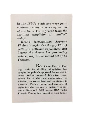 Two sets of rare and vintage promotional items (~24) from the Metropolitan Opera ca. 19th Century (approx. 4 x 3 in). These are exclusive candid camera shots of the Great Stars of the Metropolitan Opera, RCA Victor stars of the opera Die Walküre and La Traviata. These rare black and white photographs are printed on paper and verso is a caption about the image. There are images of famous stars as well as images of those connected with the productions such as: "Die Walkure" with Lucrezia Bori, Milton Cross, Kirsten Flagstad, Ludwig Hofmann, Lauritz Melchior, Friedrich Schorr, Jose Ituri (conductor). The stars and those connected with the production of "La Traviata" are Vina Bovy, Lucielle Browning, Nino Martini, Ettore Panizza (conductor), John Charles, Thomas, Thelma Votipka. All camera shots are in very good condition and come in the original blue and green envelopes. There is water damage, holes and tears to the envelopes. Flaps are missing. Printed on the envelope of La Traviata is “Form 2697 and Printed in the U.S.A. “ Printed on the information card and the envelope of Die Walküre is “Form 2698 and Printed in the U.S.A.“