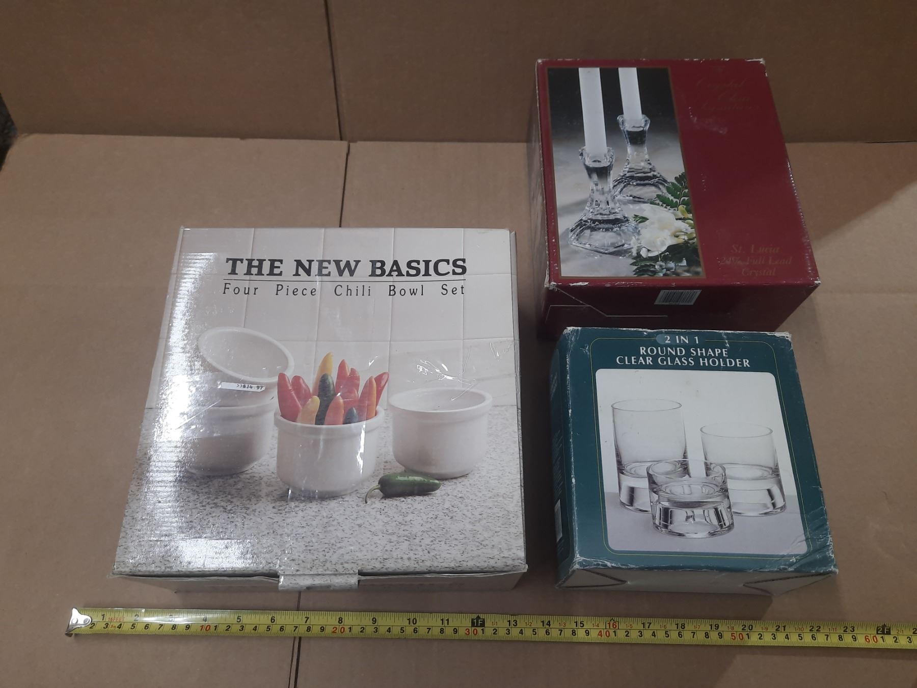 The New Basics Four Piece Chilli Bowl Set (New), Round Shape Clear Glass Holder (New) and Pair of Crystal Clear Candle Holders. (New)