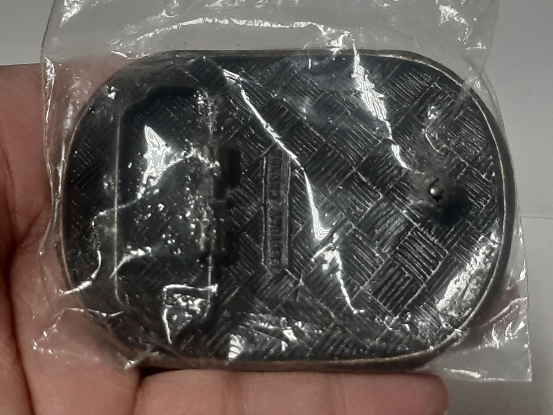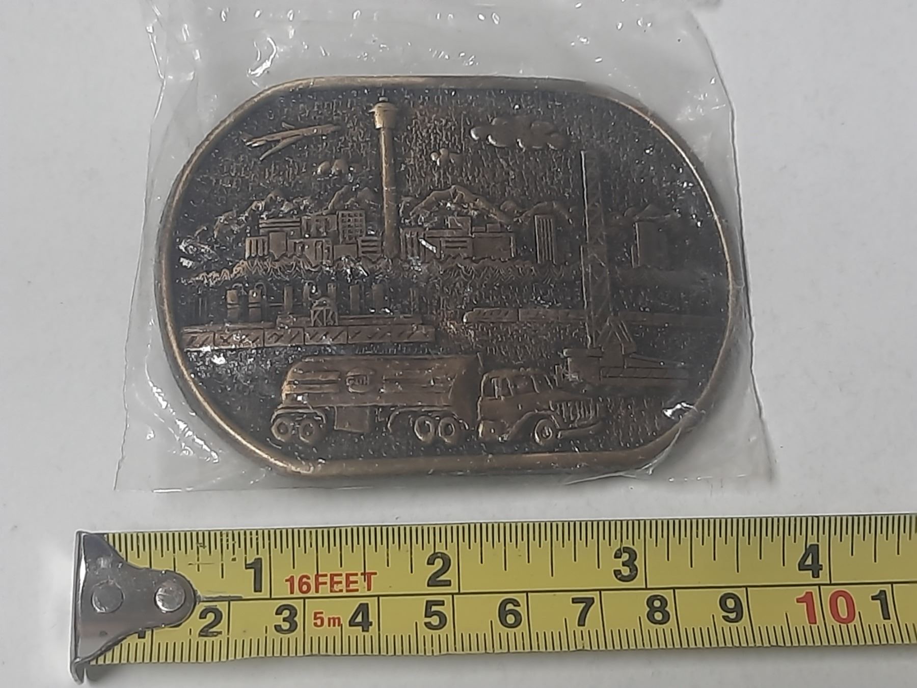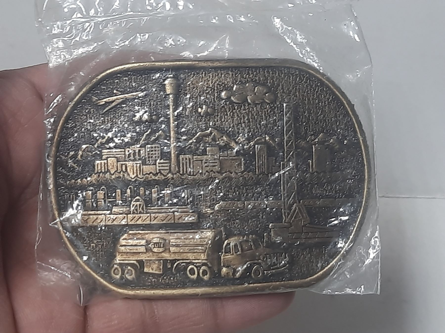 Lot 423 Vintage Gulf Oil Canada promotional belt buckle, depicting a detailed industrial oil refinery scene