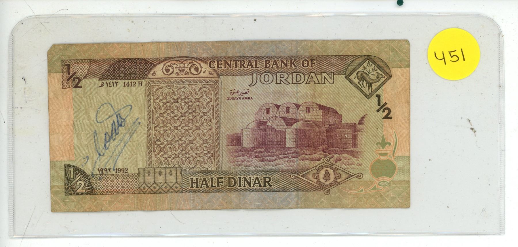 Lot 451 Jordan 1/2 Dinar banknote issued by the Central Bank of Jordan.