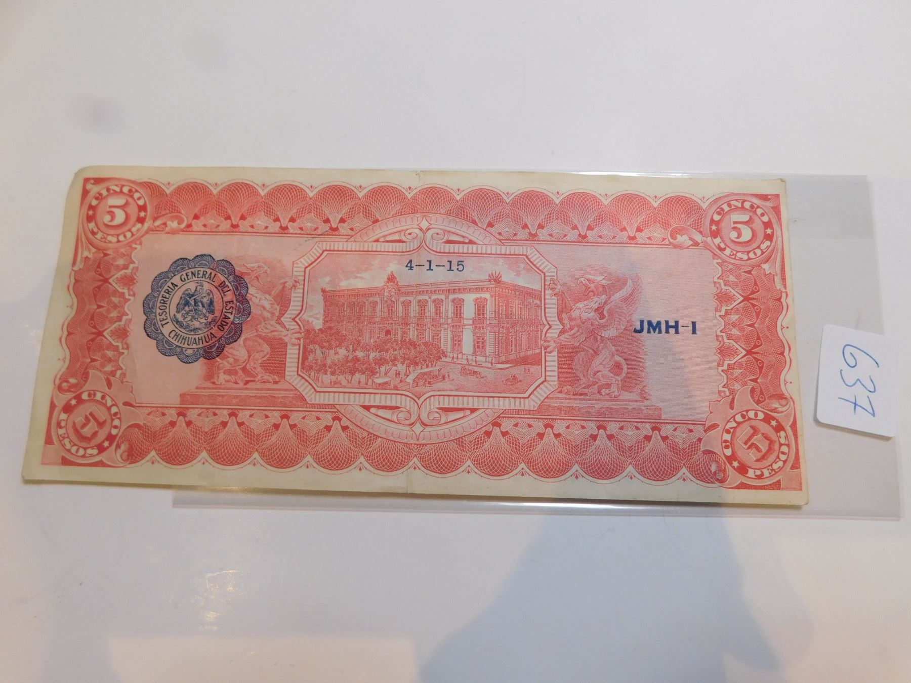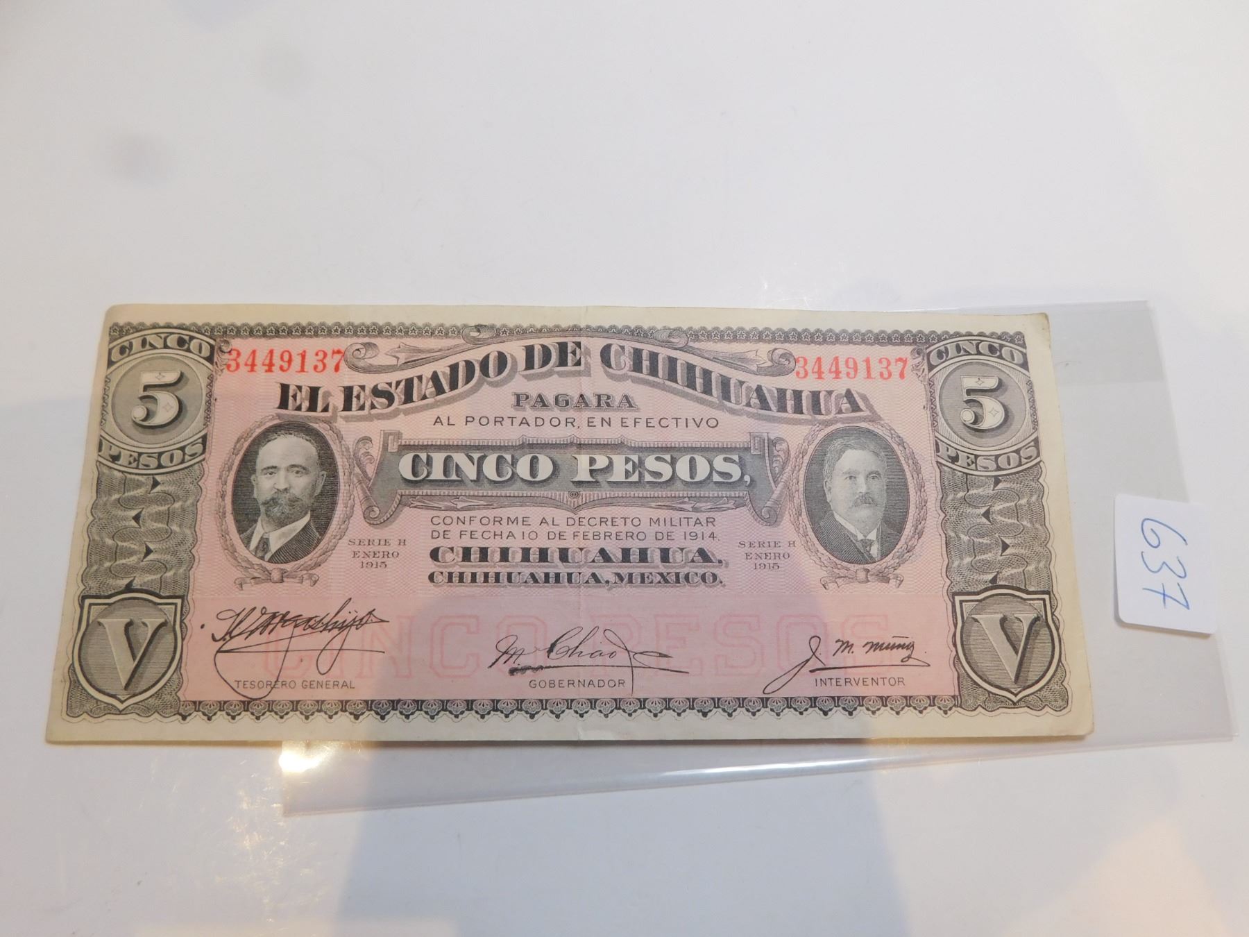Lot 637 MEXICAN REVOLUTION 5 PESO BILL, CHIHUAHUA PROVINCE, 1915