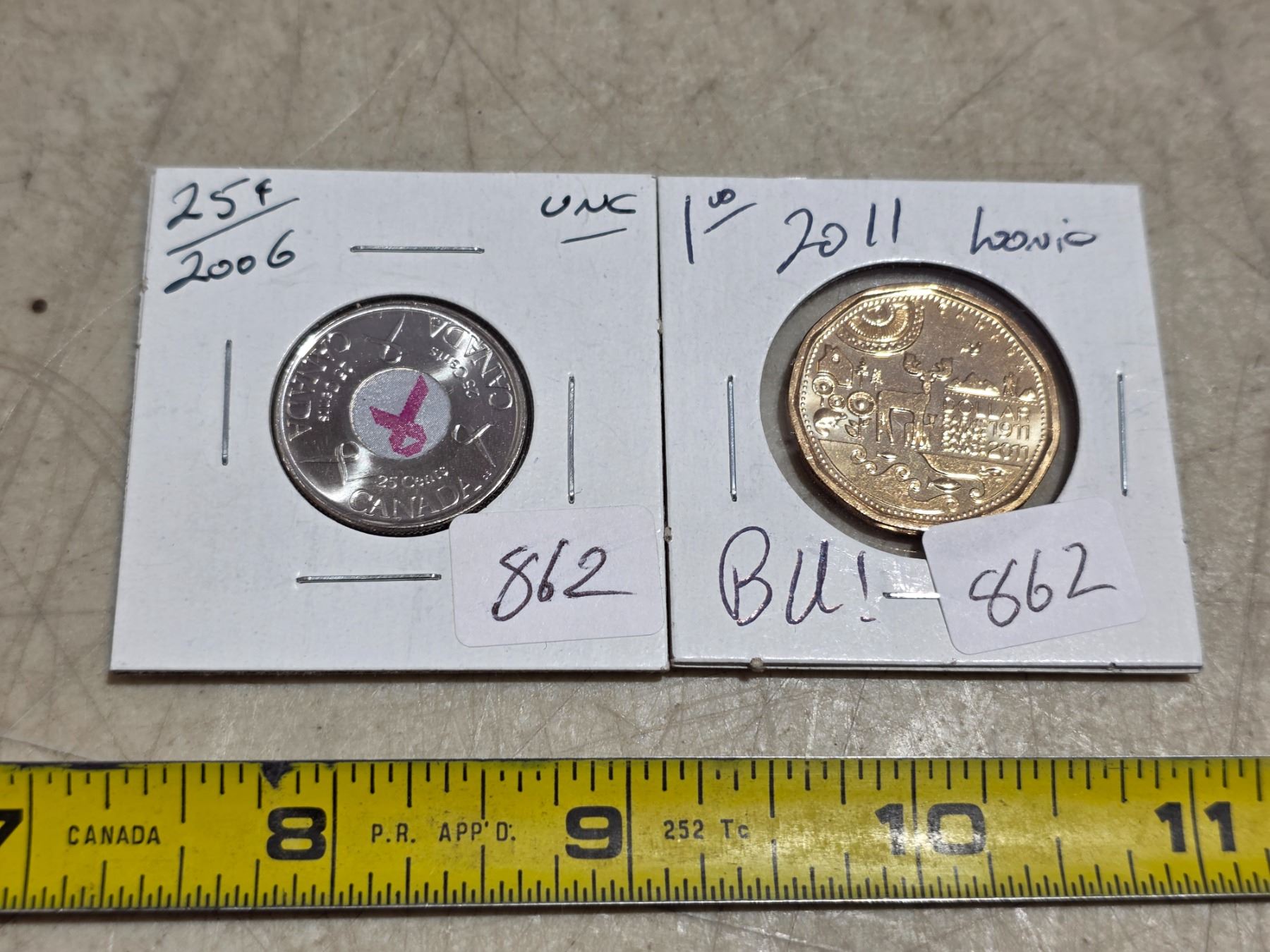 Lot 862 2011 canadian loonie and 2006 pink ribbon 25 cents