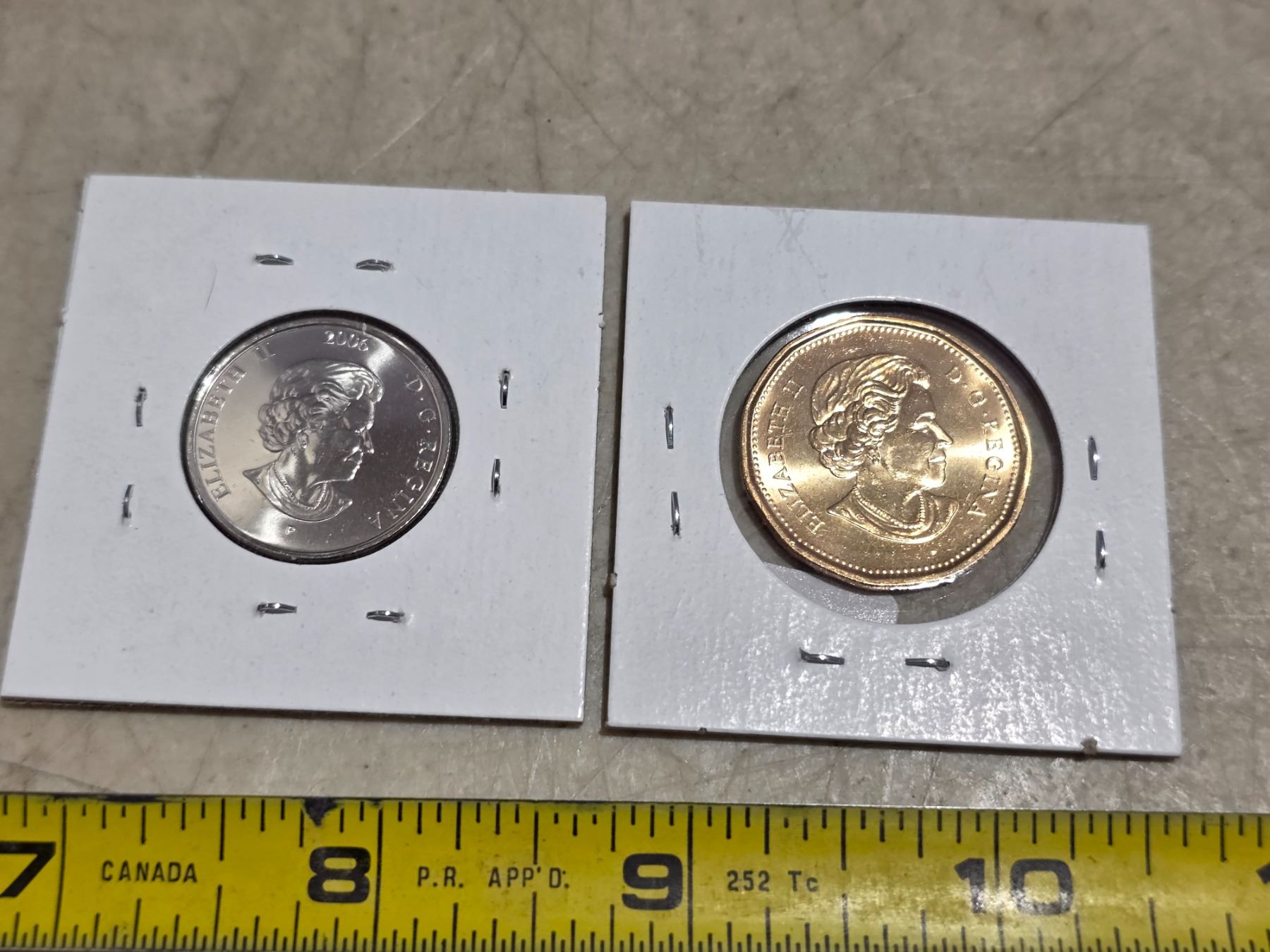 2011 canadian loonie and 2006 pink ribbon 25 cents