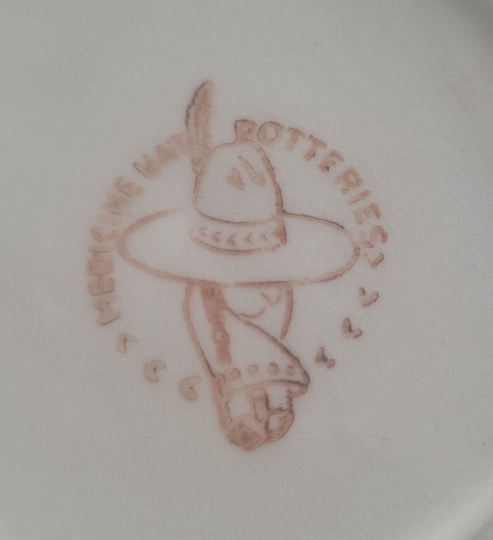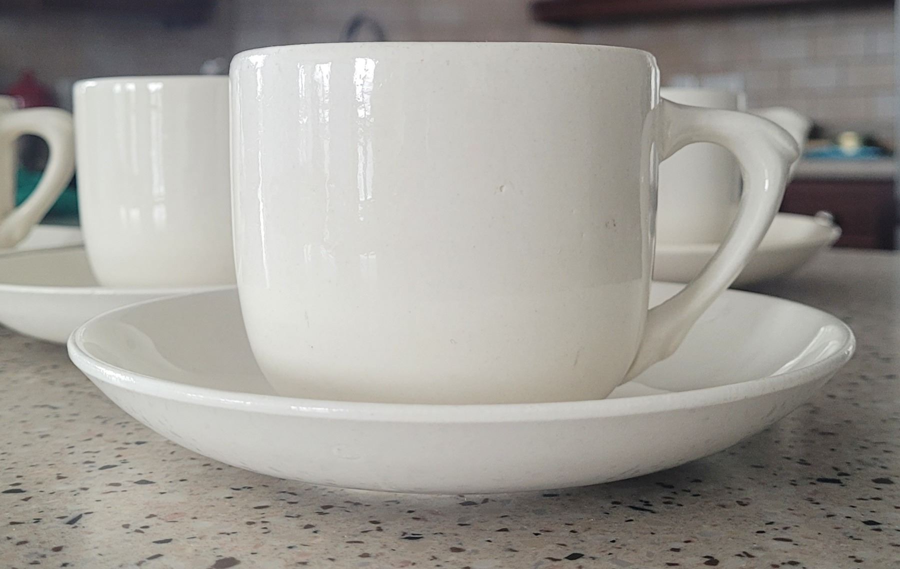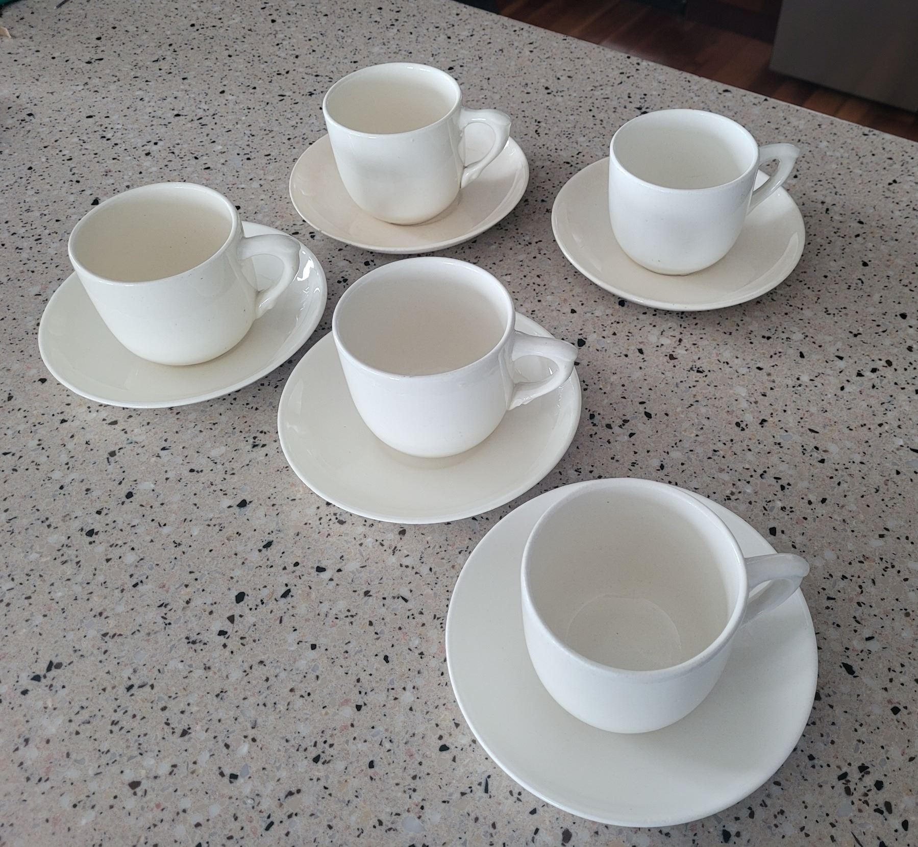 Medicine Hat Potteries, set of five teacups with saucers, ivory coloured