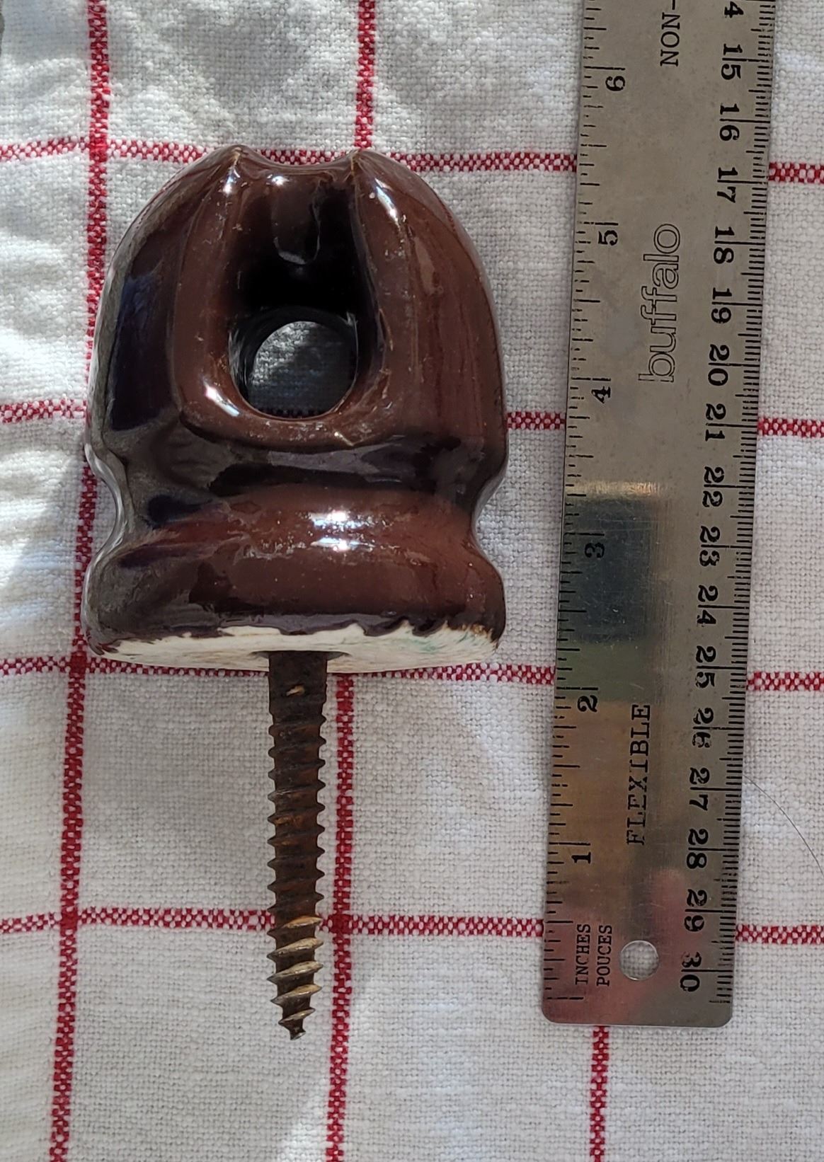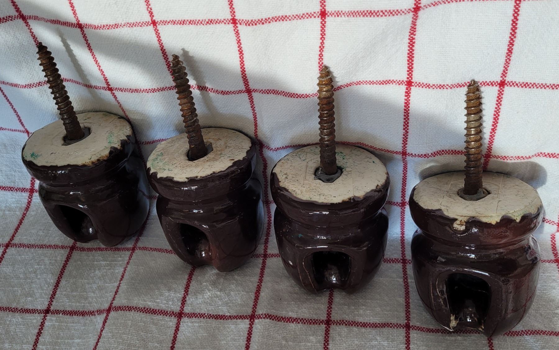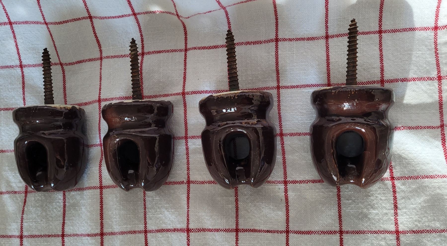 Set of four vintage brown ceramic insulators with lag screw - 3" tall