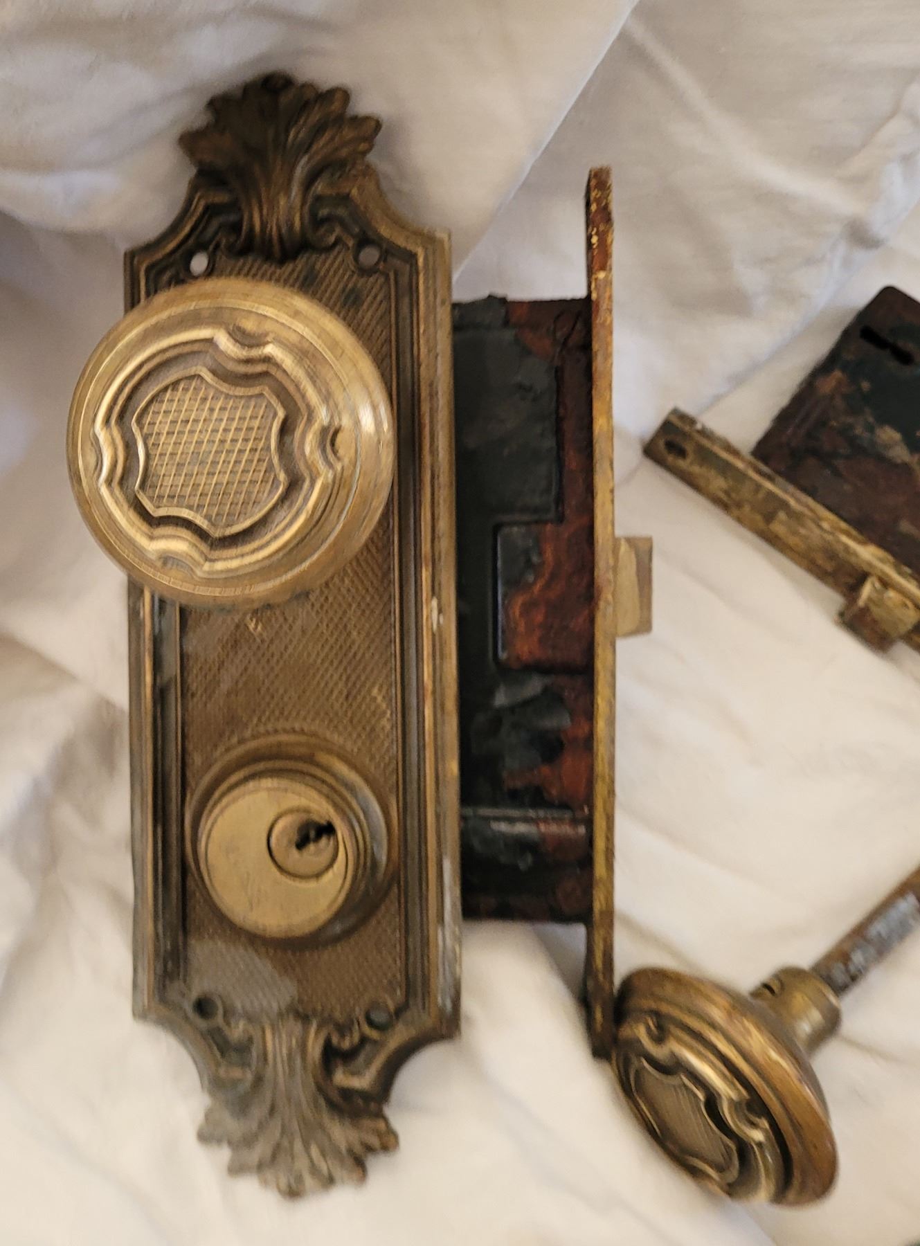 Antique "Racine" Pattern (1905-1908) 2.25" diameter solid brass doorknobs and door sets (French Art Noveau style)
