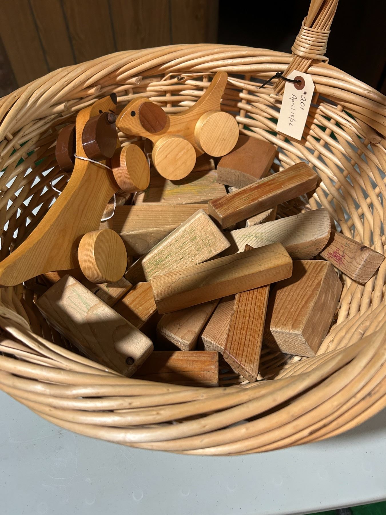 Lot 201 Wooden block toys, pull toys, and wicker basket