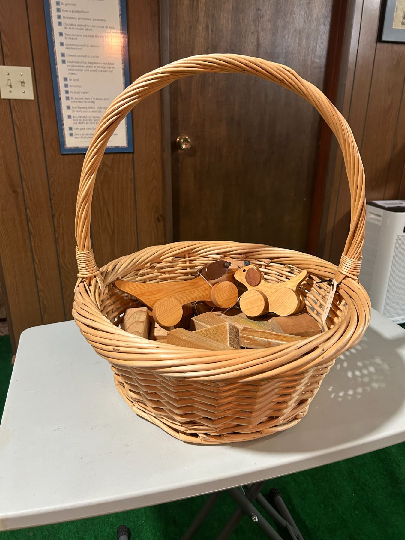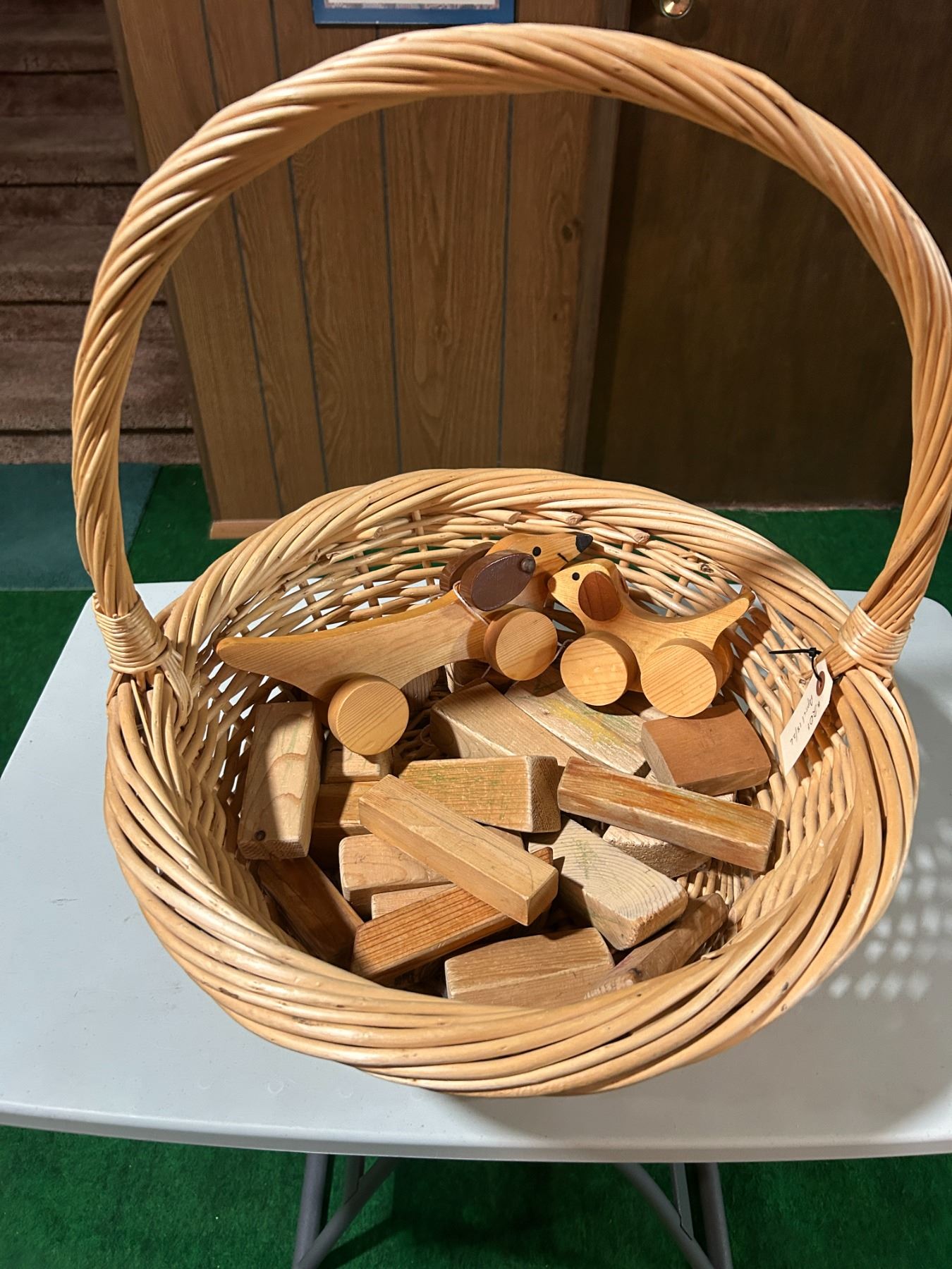 Wooden block toys, pull toys, and wicker basket