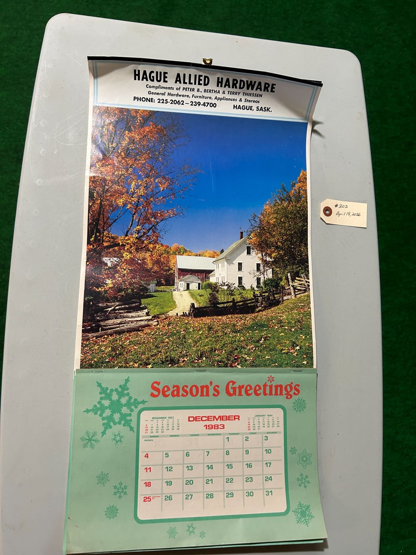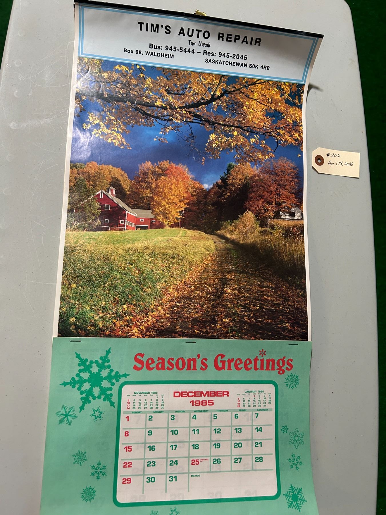 Lot 202 1984 and 1986 wall calendars, complete, Hague Hardware and Tim’s Auto Repair