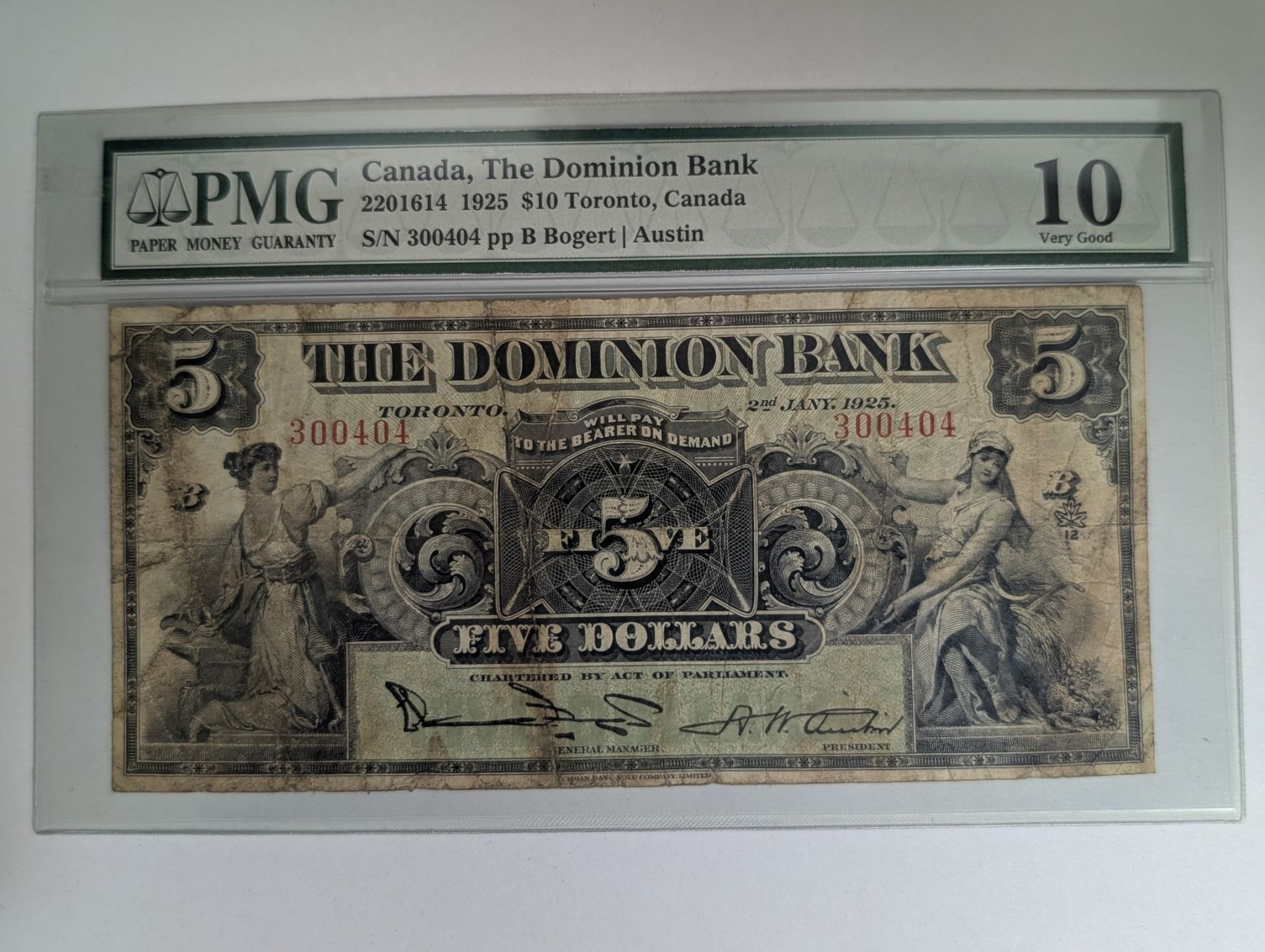 Canadian THE DOMINION BANK 5 Dollar Bill 2201614 1925 PMG Graded 10 (On Grade, It Says 10 Dollar, Possible Error)