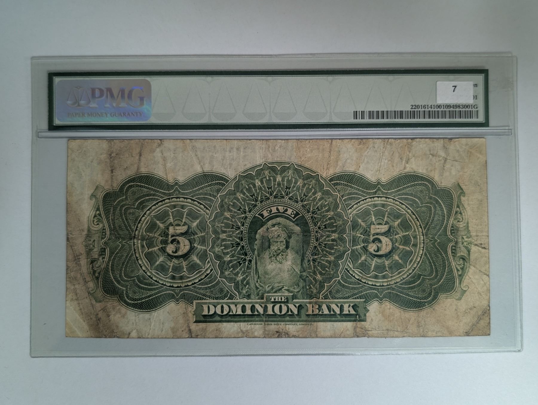 Lot 369 Canadian THE DOMINION BANK 5 Dollar Bill 2201614 1925 PMG Graded 10 (On Grade, It Says 10 Dollar, Po