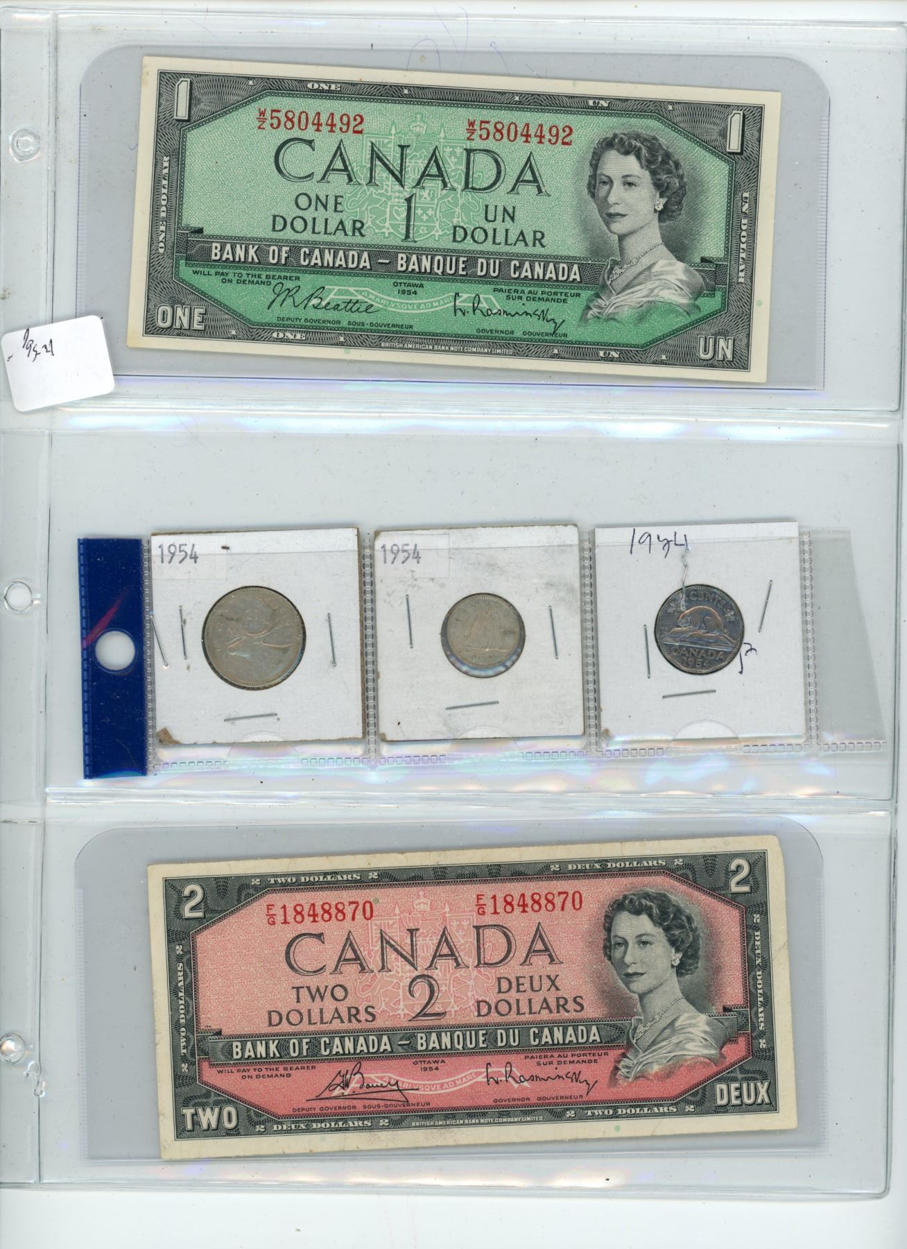 Canadian 1954 Bill and Coin set (1 and 2 Dollar) (25, 10, 5 Cents)