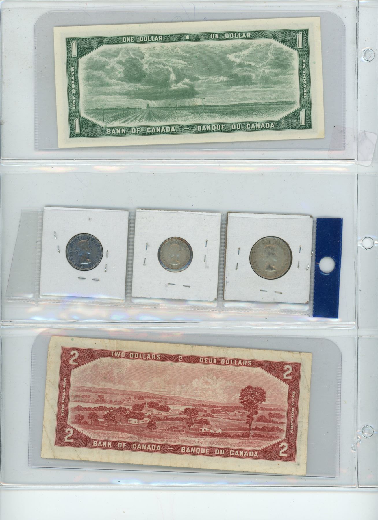 Lot 385 Canadian 1954 Bill and Coin set (1 and 2 Dollar) (25, 10, 5 Cents)