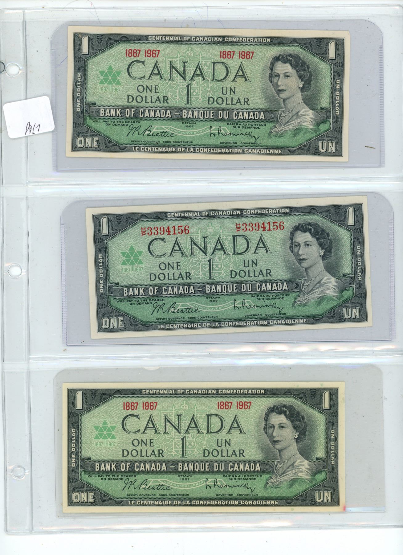 Lot 391 (3) Canadian 1967 1 Dollar Bills 3394156 and 1867-1967