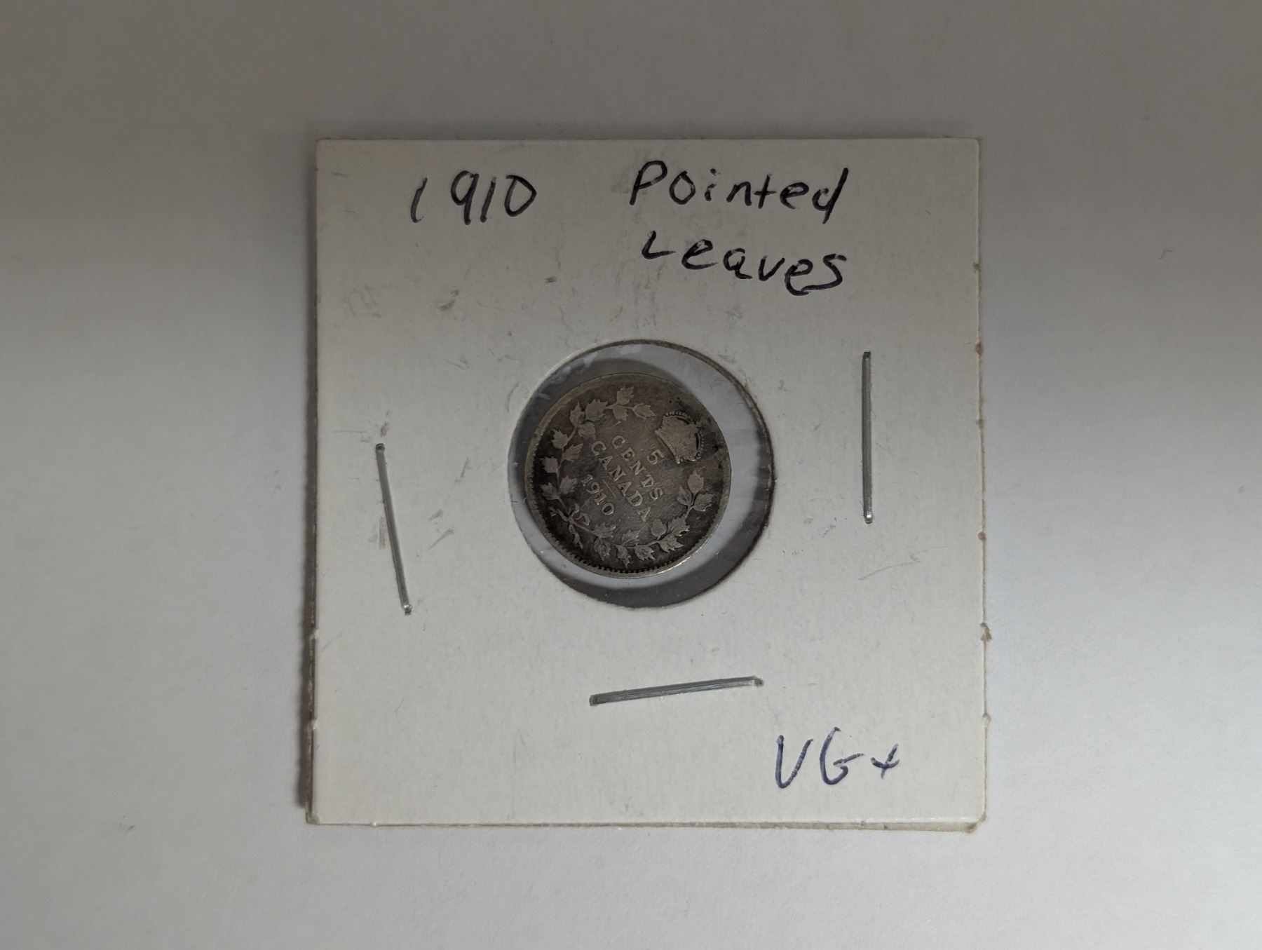 Lot 400 1910 Pointed Leaves VG+ 5 Cent Coin