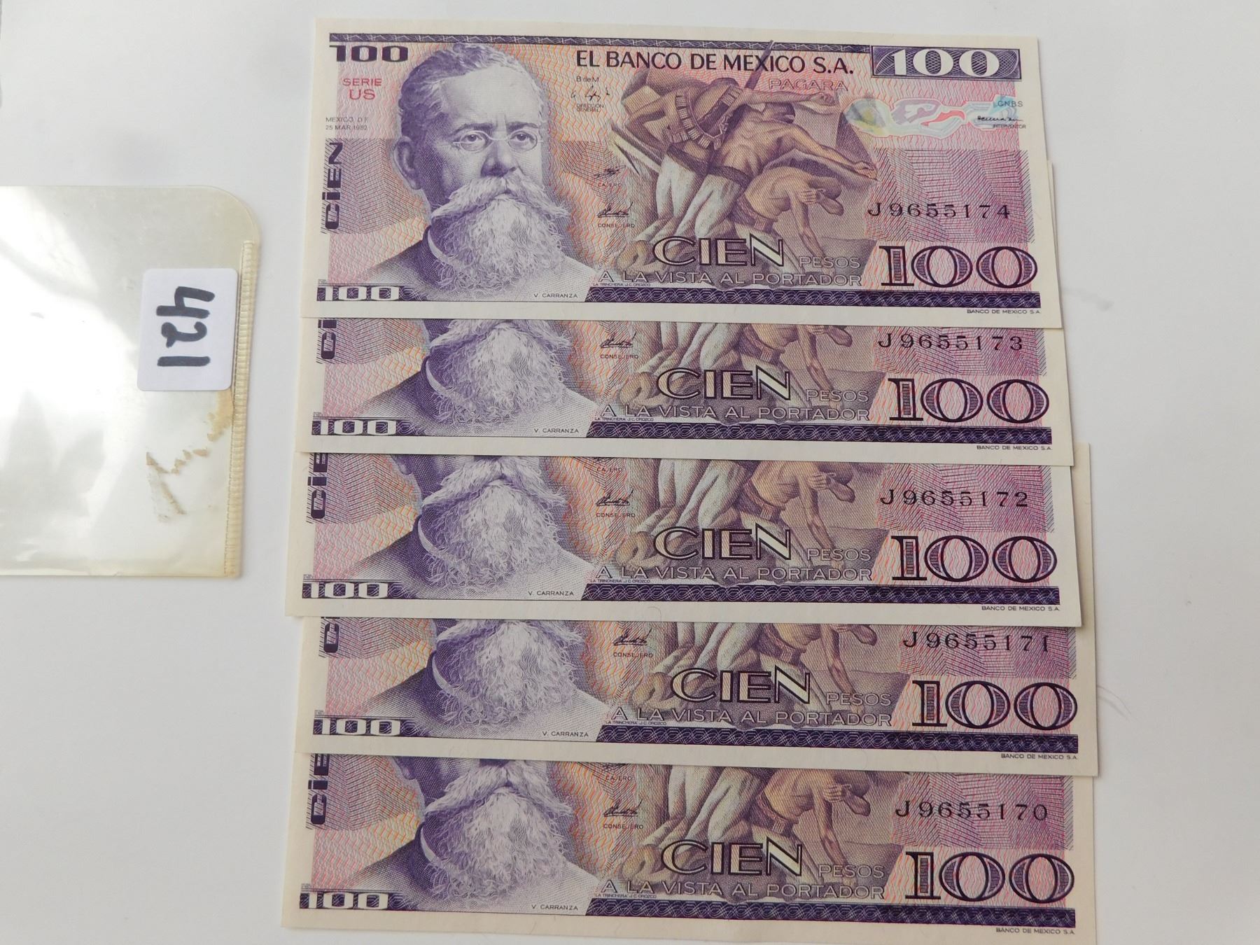 Lot 421 5-CONNSECUTIVE 100 PESO MEXICAN BILLS UNC