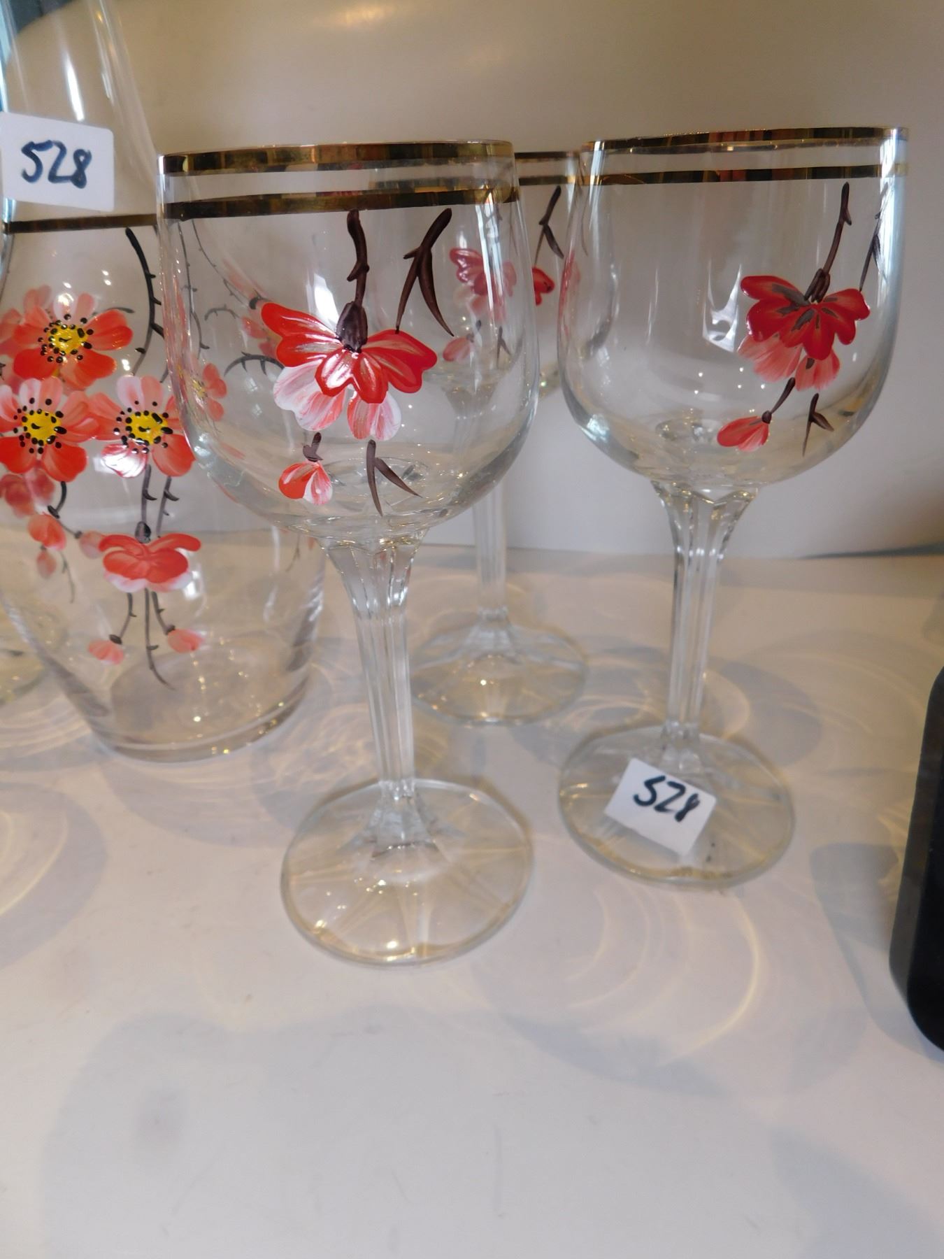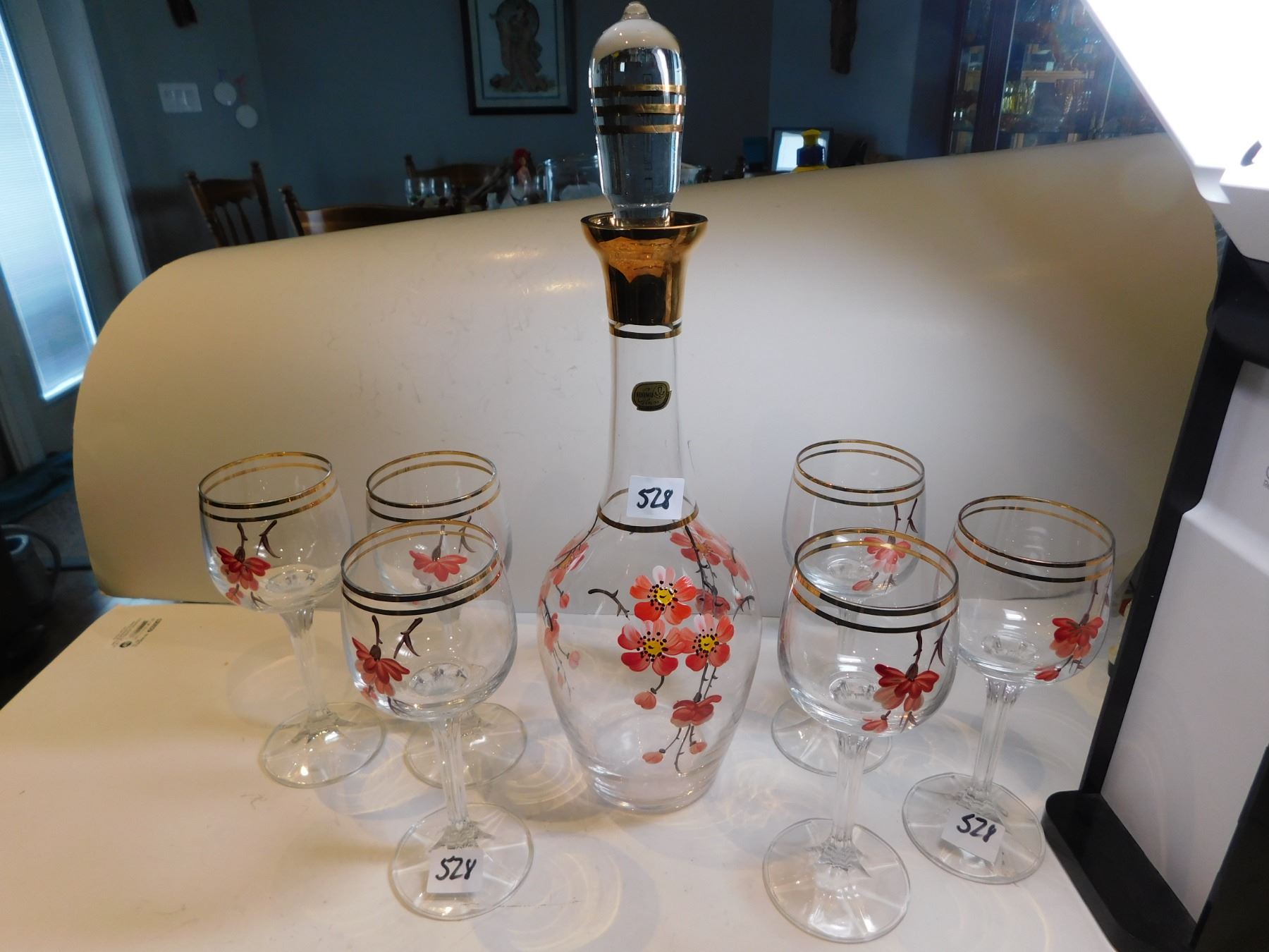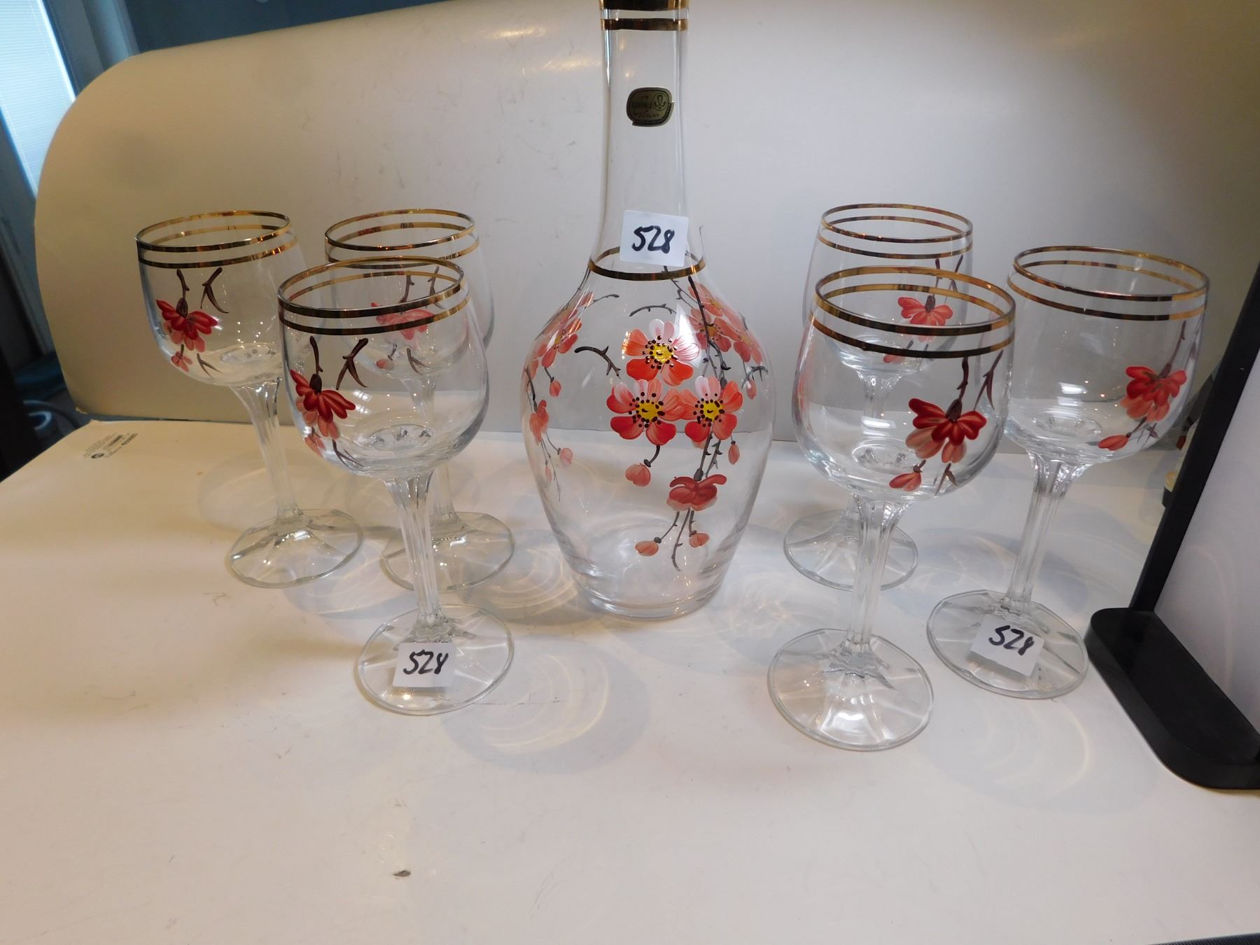 Lot 528 BOHEMIAN PAINTED GLASS CARAFE WITH LID AND SIX MATCHING GLASSES