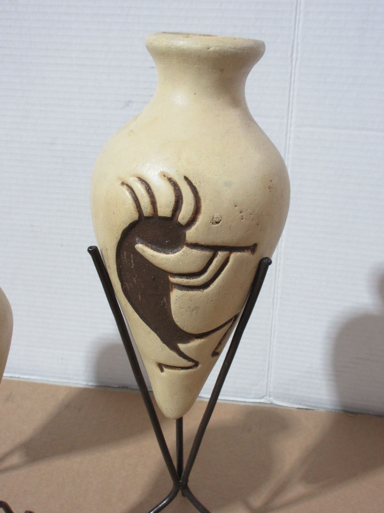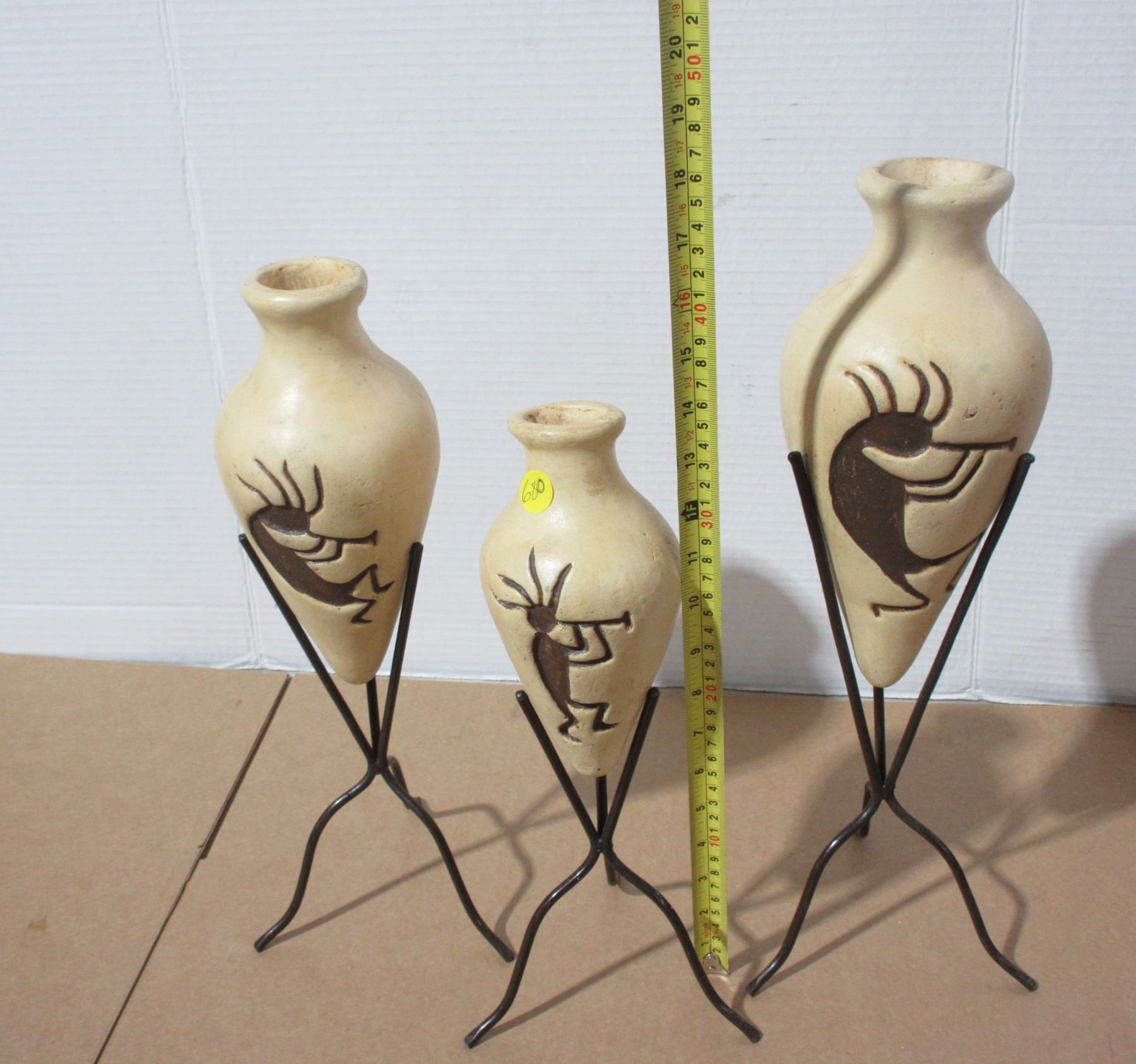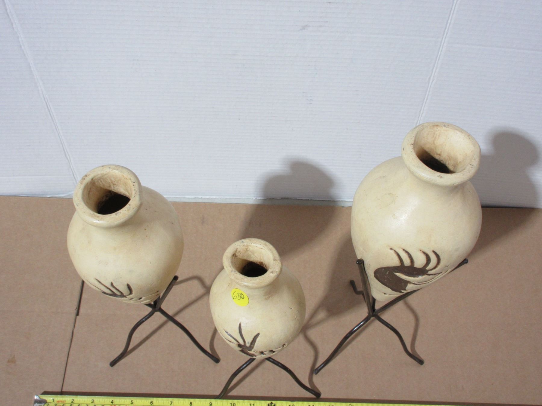 Lot 680 3 Clay Uases In Racks. (3 Different Sizes)