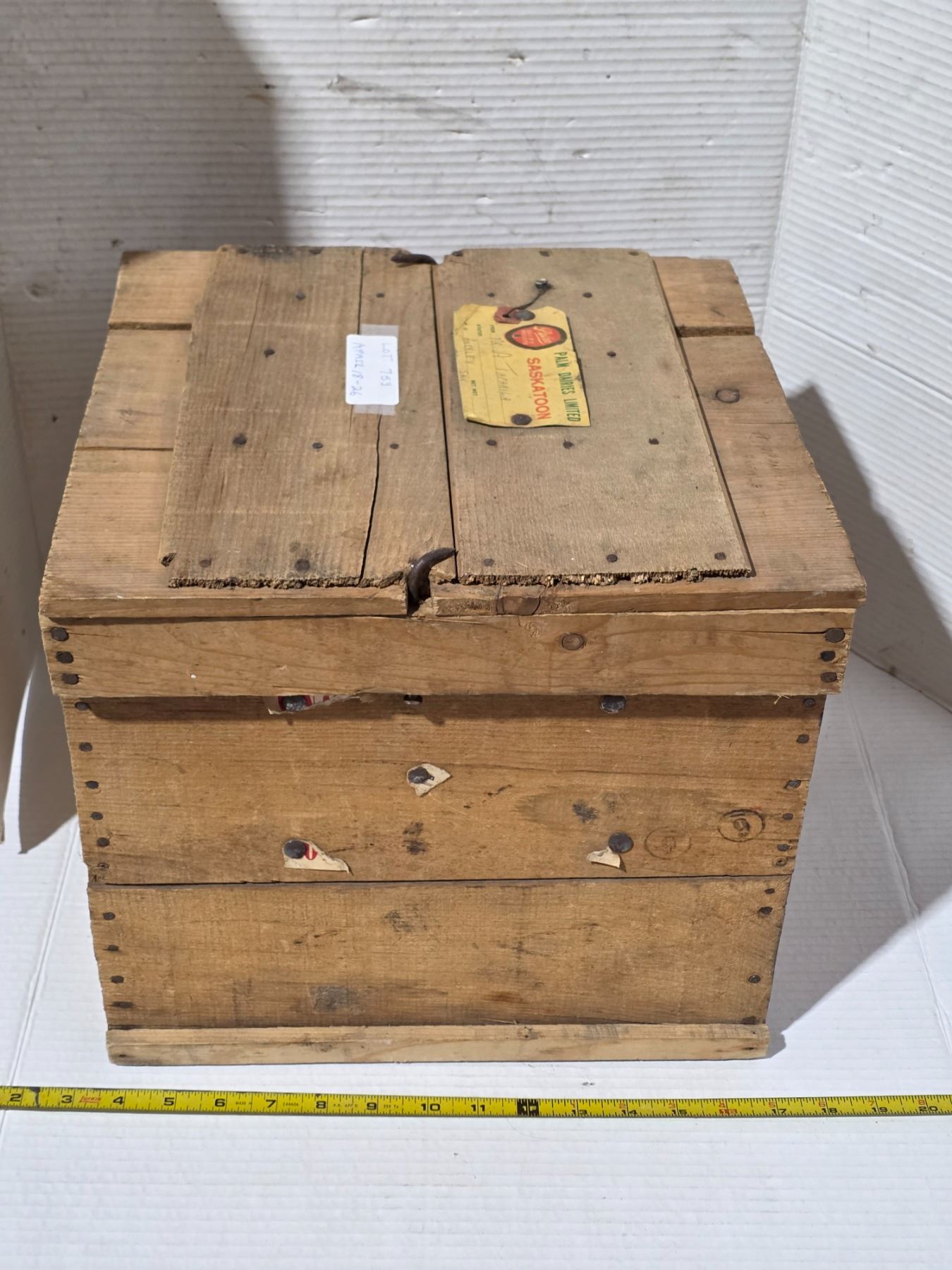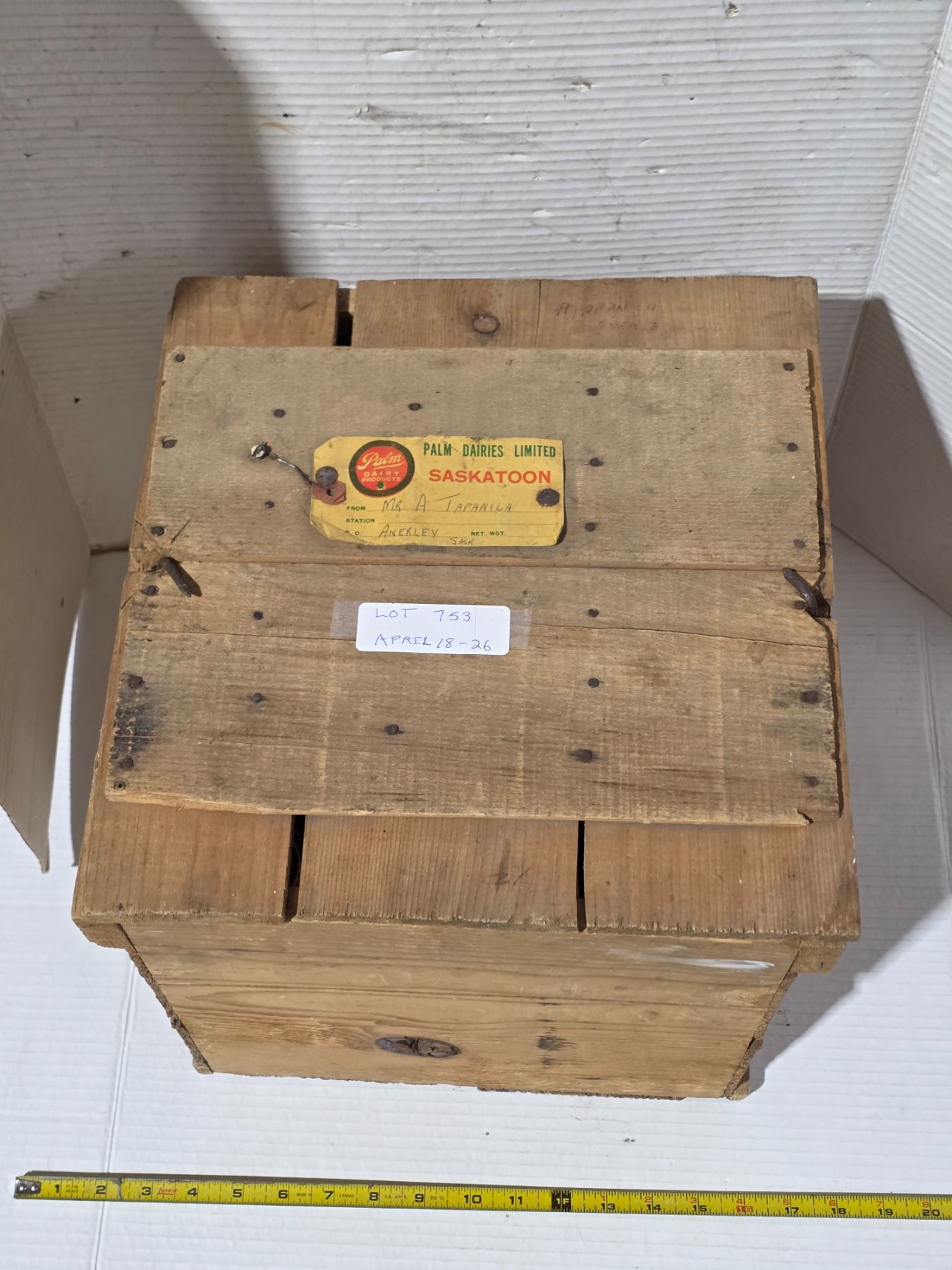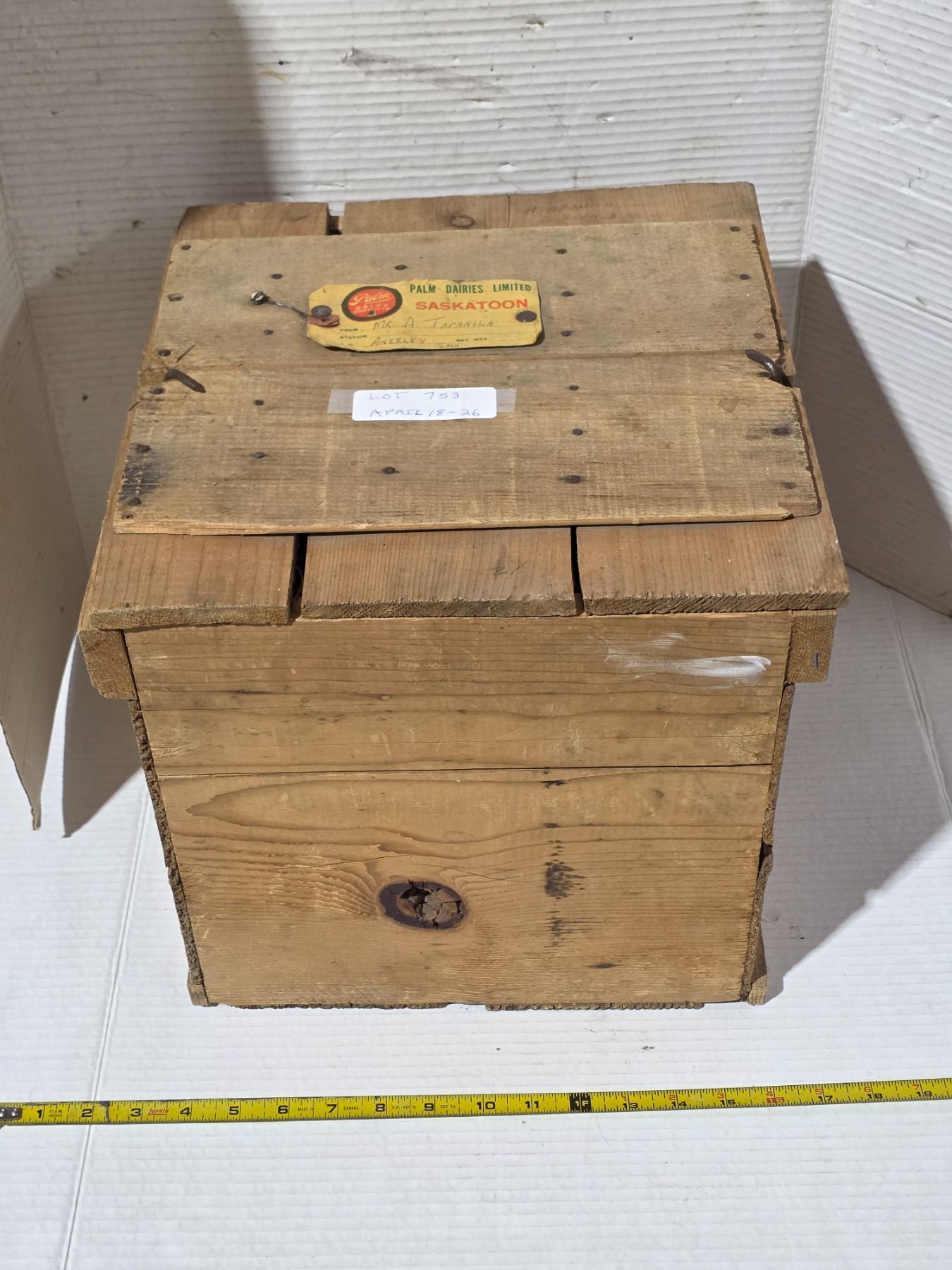 Lot 753 Vinatge wooden egg crate with cardboard flats, palm dairies saskatoon label- 13" by13" by 13"H