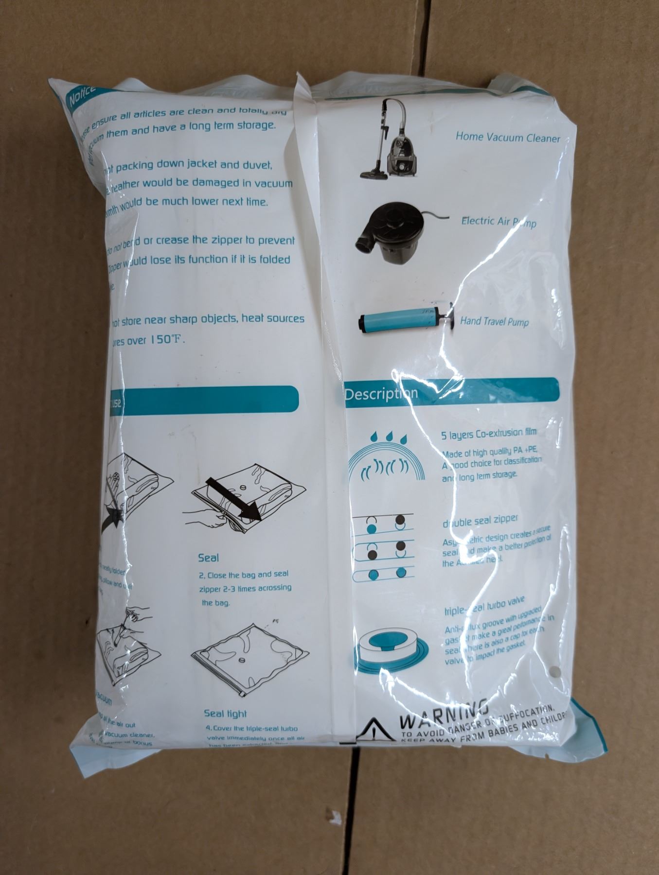 Ten Vacuum Storage Bags. Compatible with home vacuum cleaner, electric air pump and hand travel pump. Factory sealed, never opened package contains: 40*60 cm x2 pcs, 50*70 cm x3 pcs, 60*80cm x2 pcs and one hand pump.