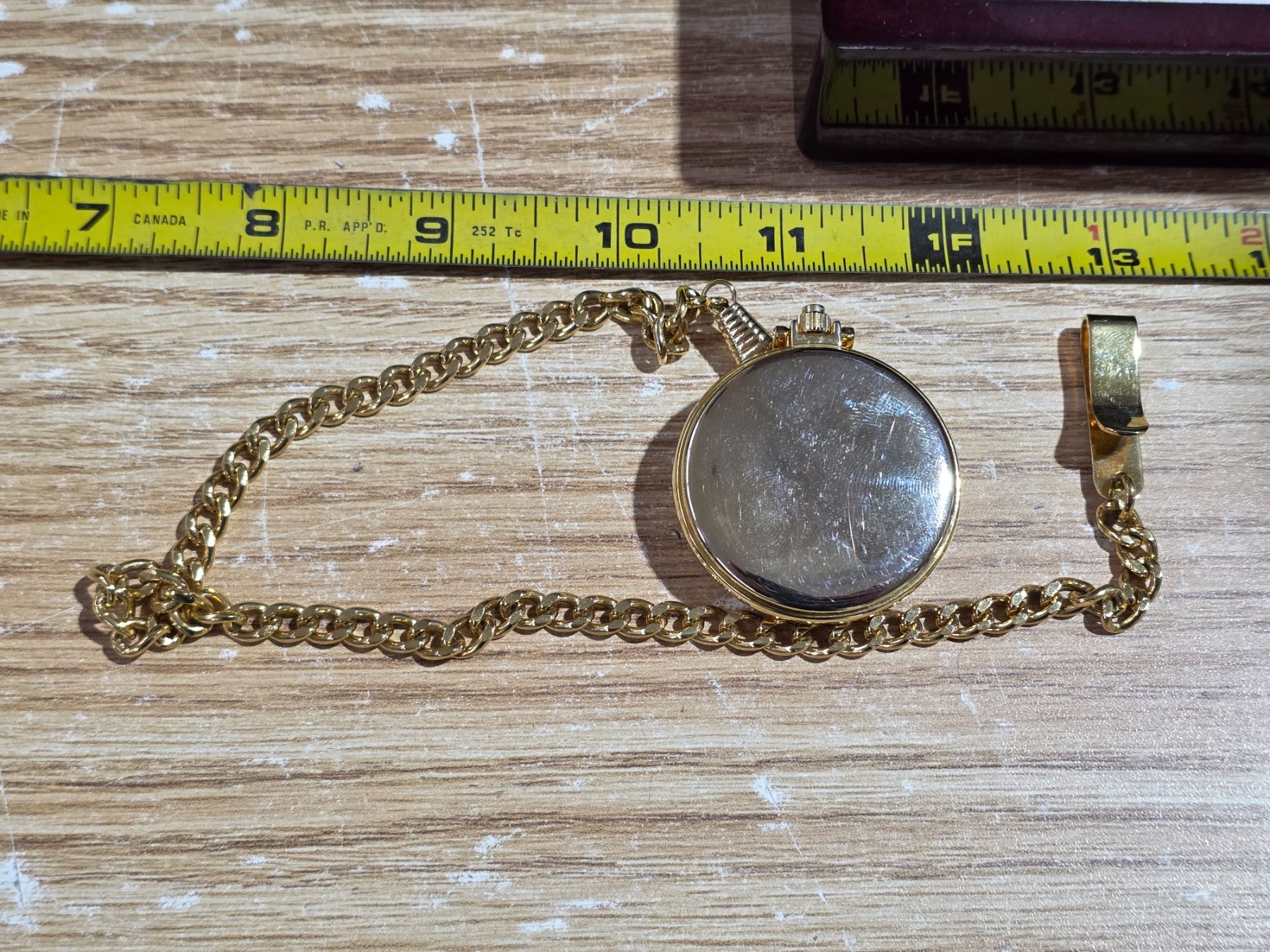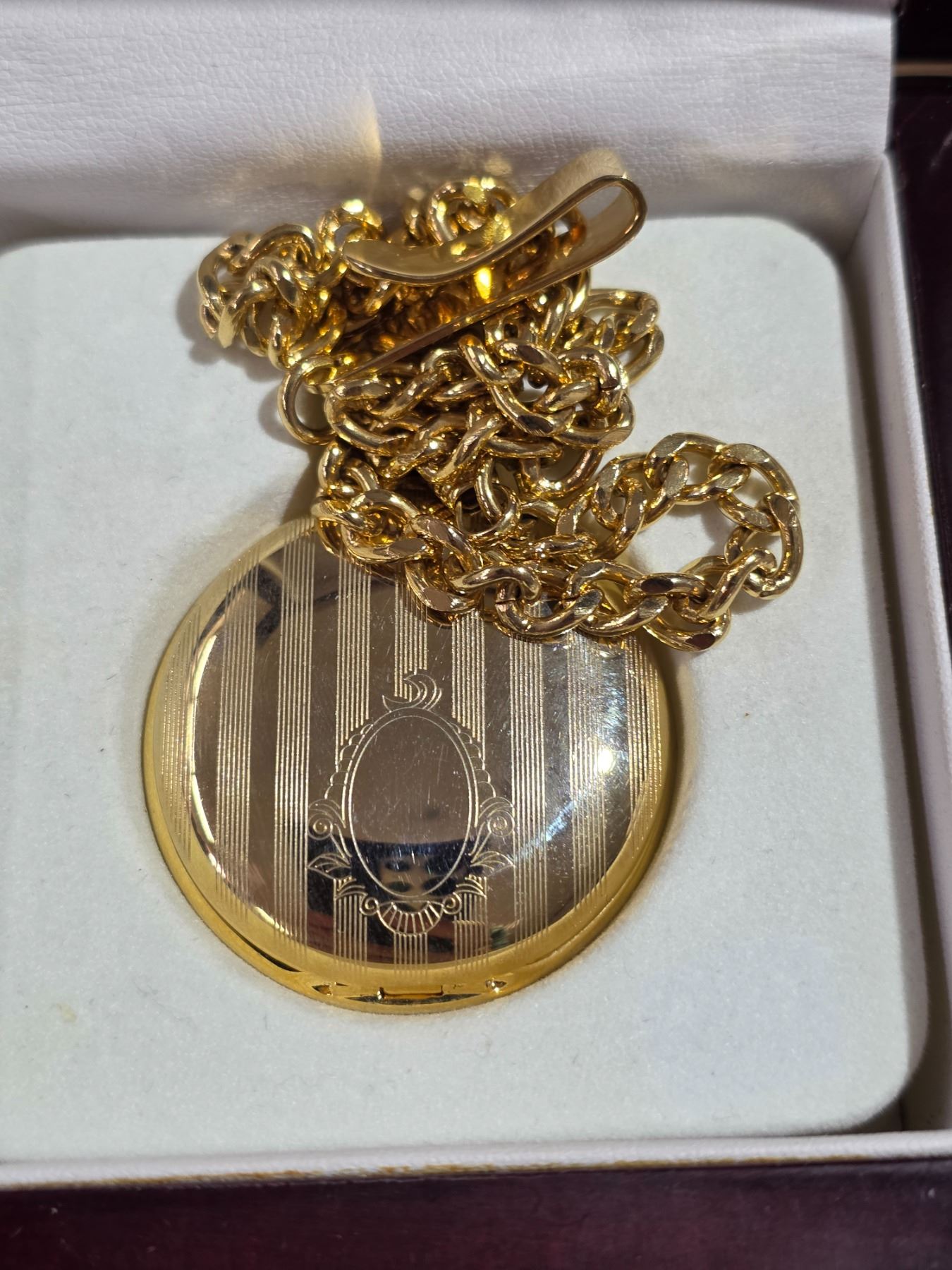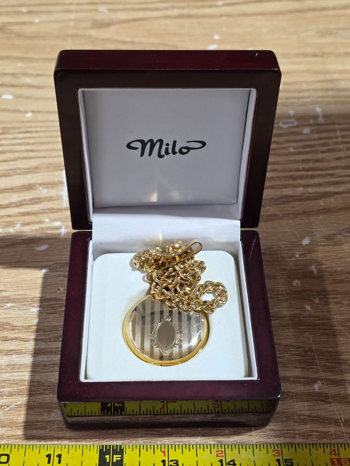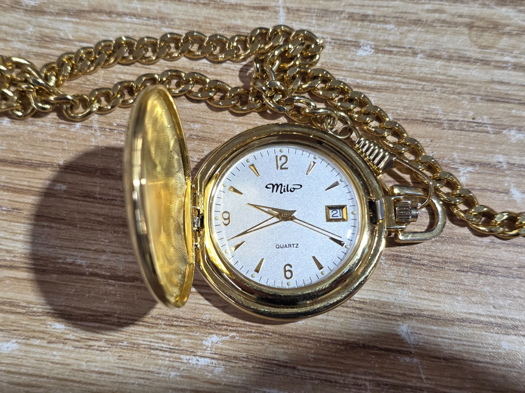 New milo gold tone, quartz pocket watch with case