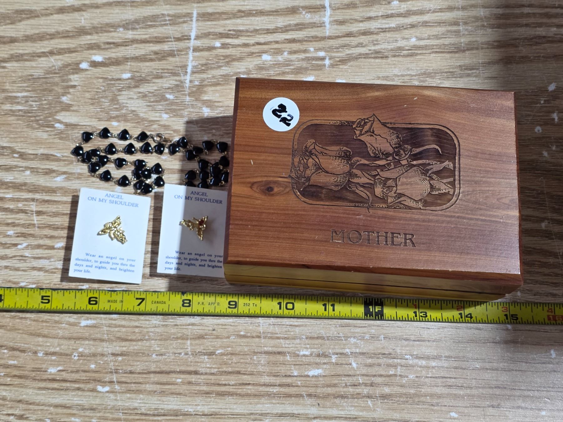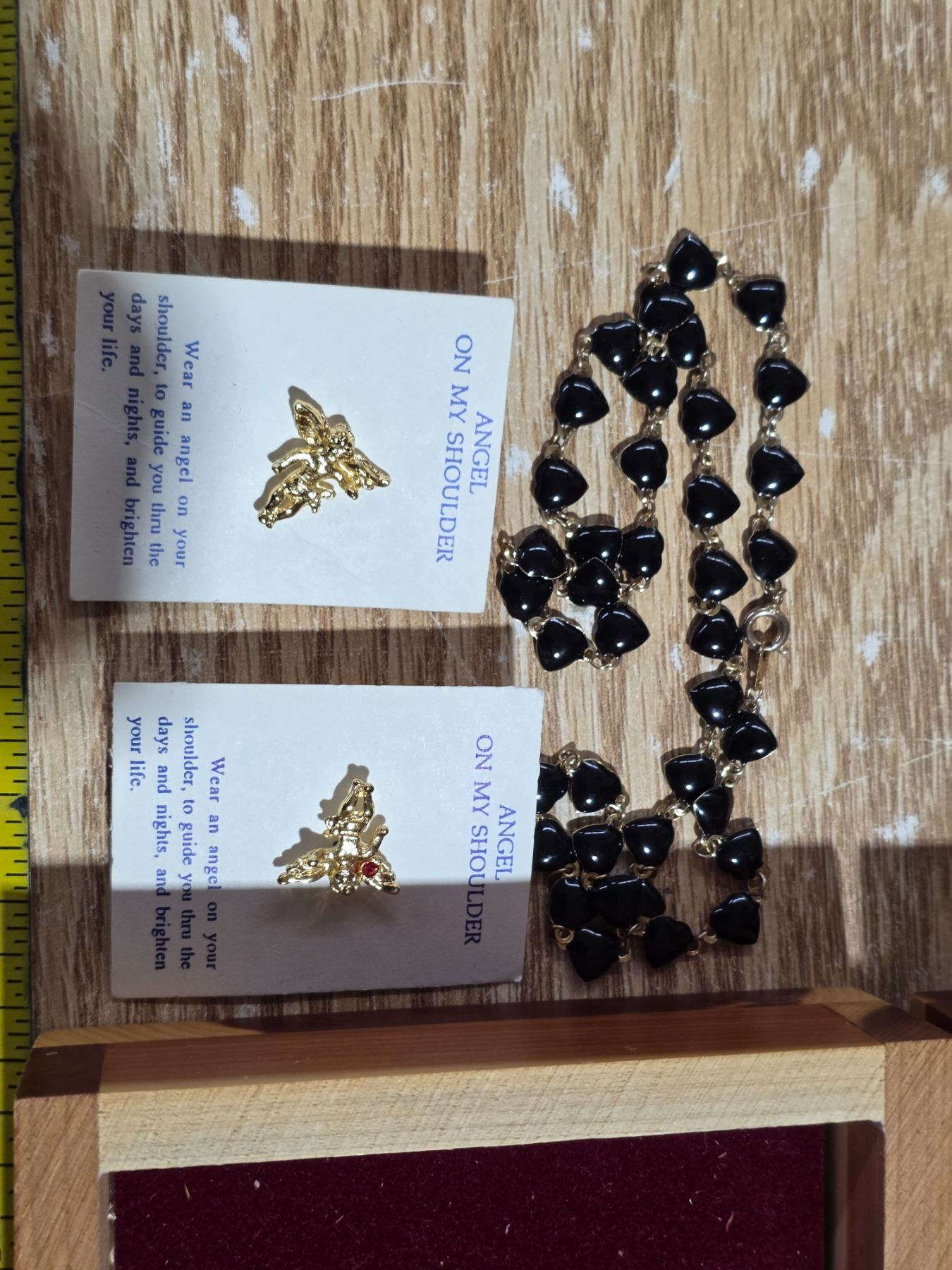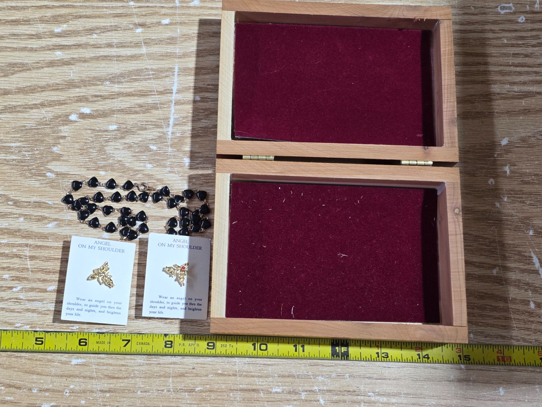 Lot 789 Jewelry box with heart shaped necklace and 2 angel on shoulder earrings