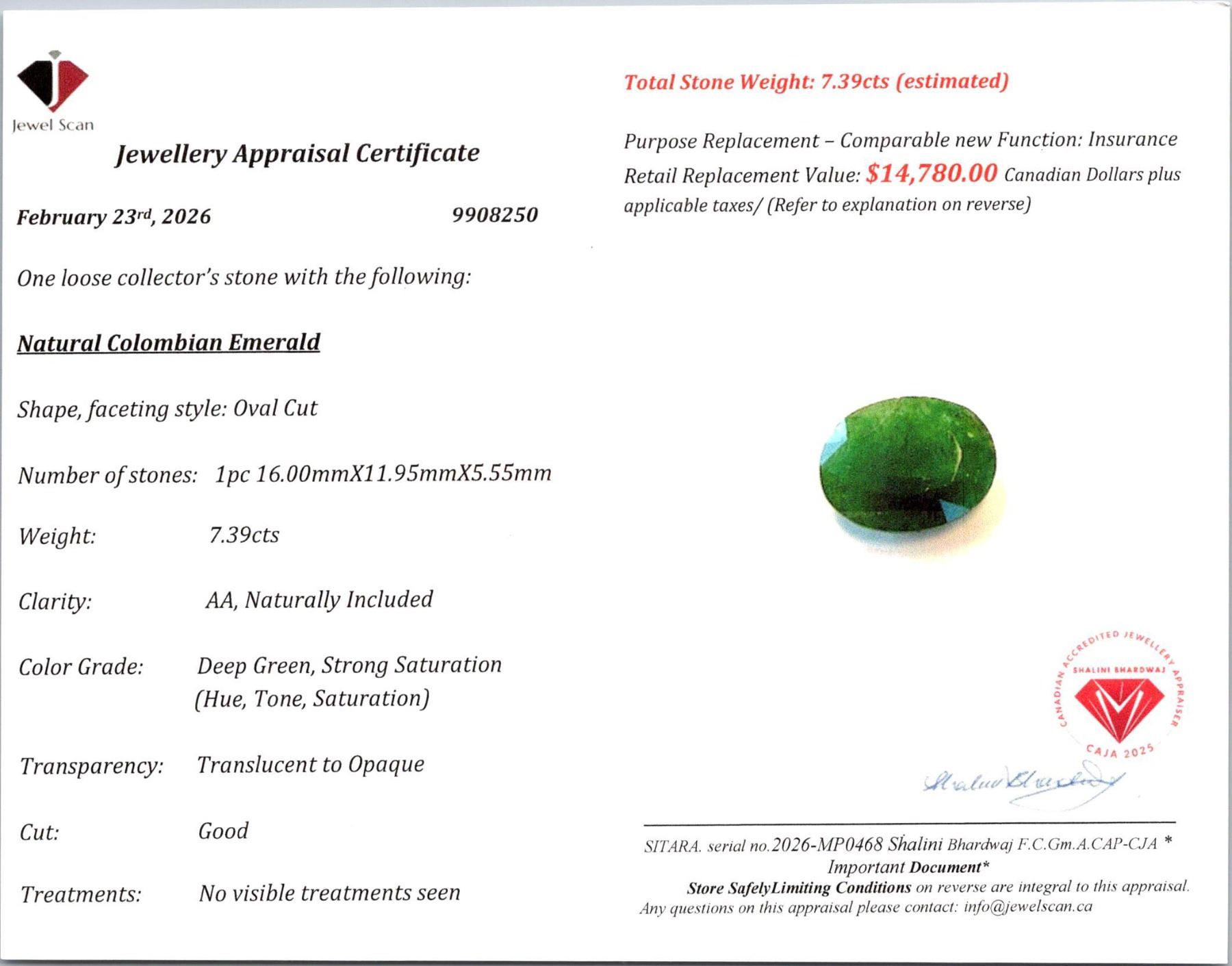 7.39 ct Certified Colombian Emerald gemstone ($14,780 Appraisal)