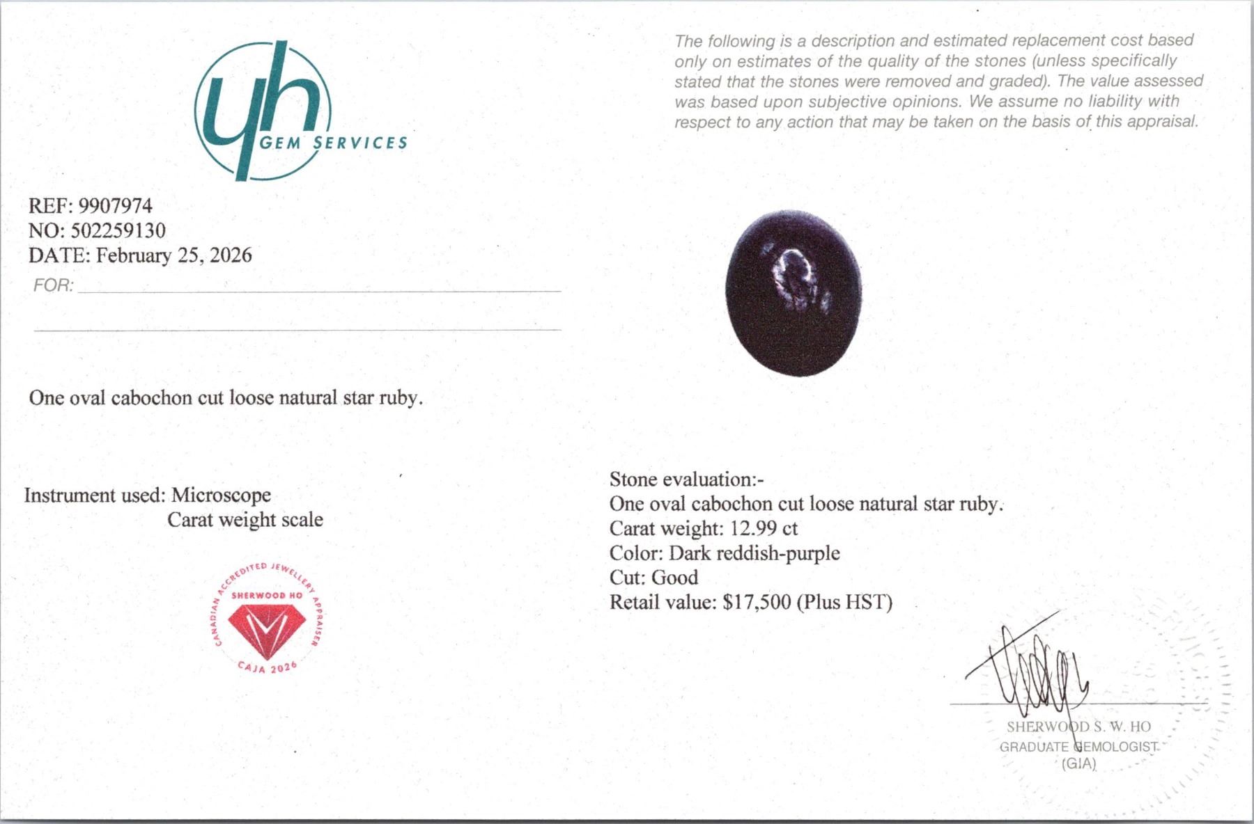 Lot 892 12.99 ct Certified Star Ruby gemstone Untreated ($17,500 Appraisal)