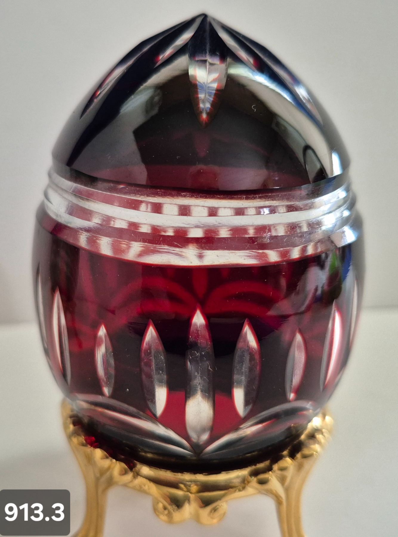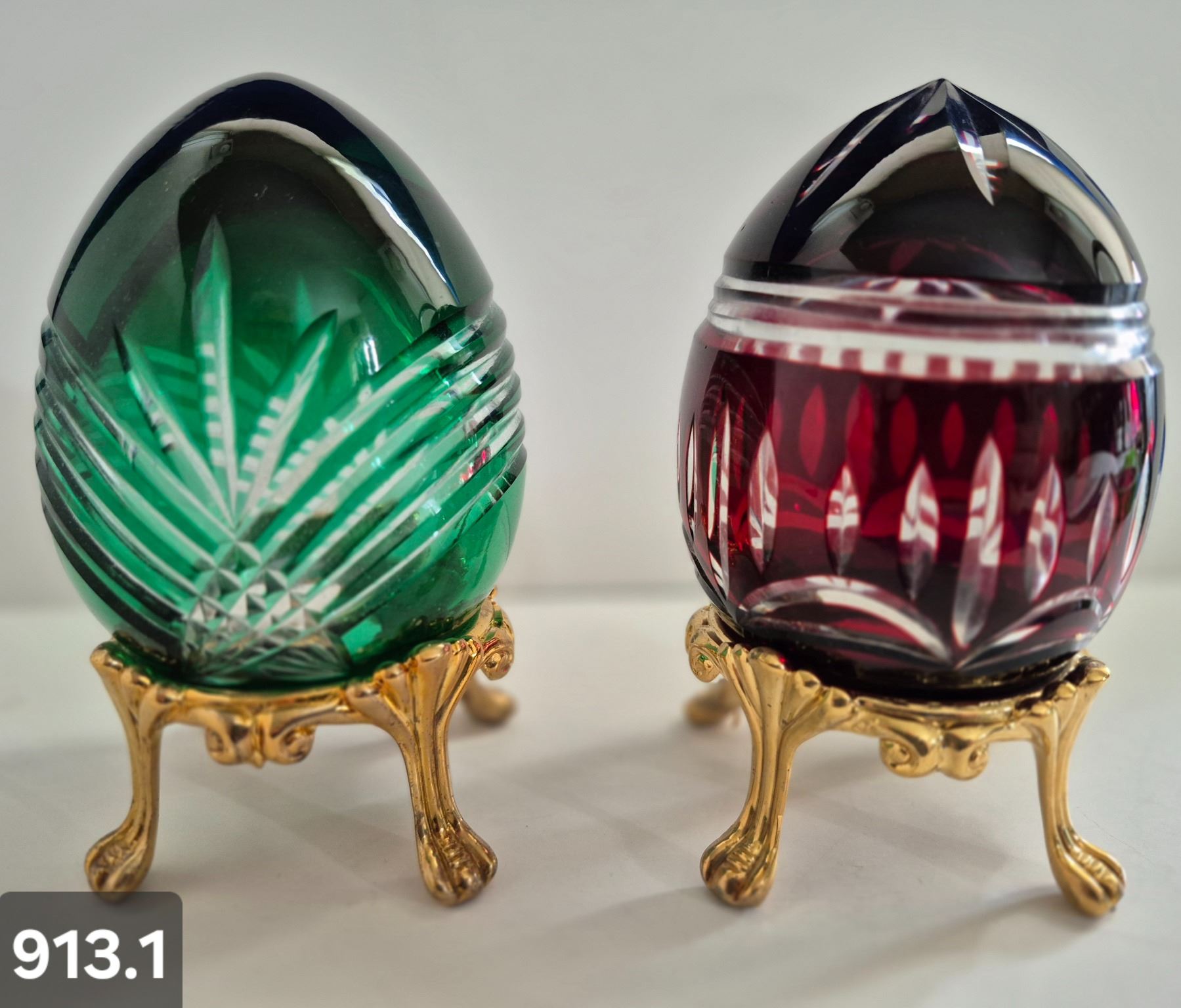 913. Pair of Bohemian cut glass MCM eggs - 24k gold-plated stand, from a large collection