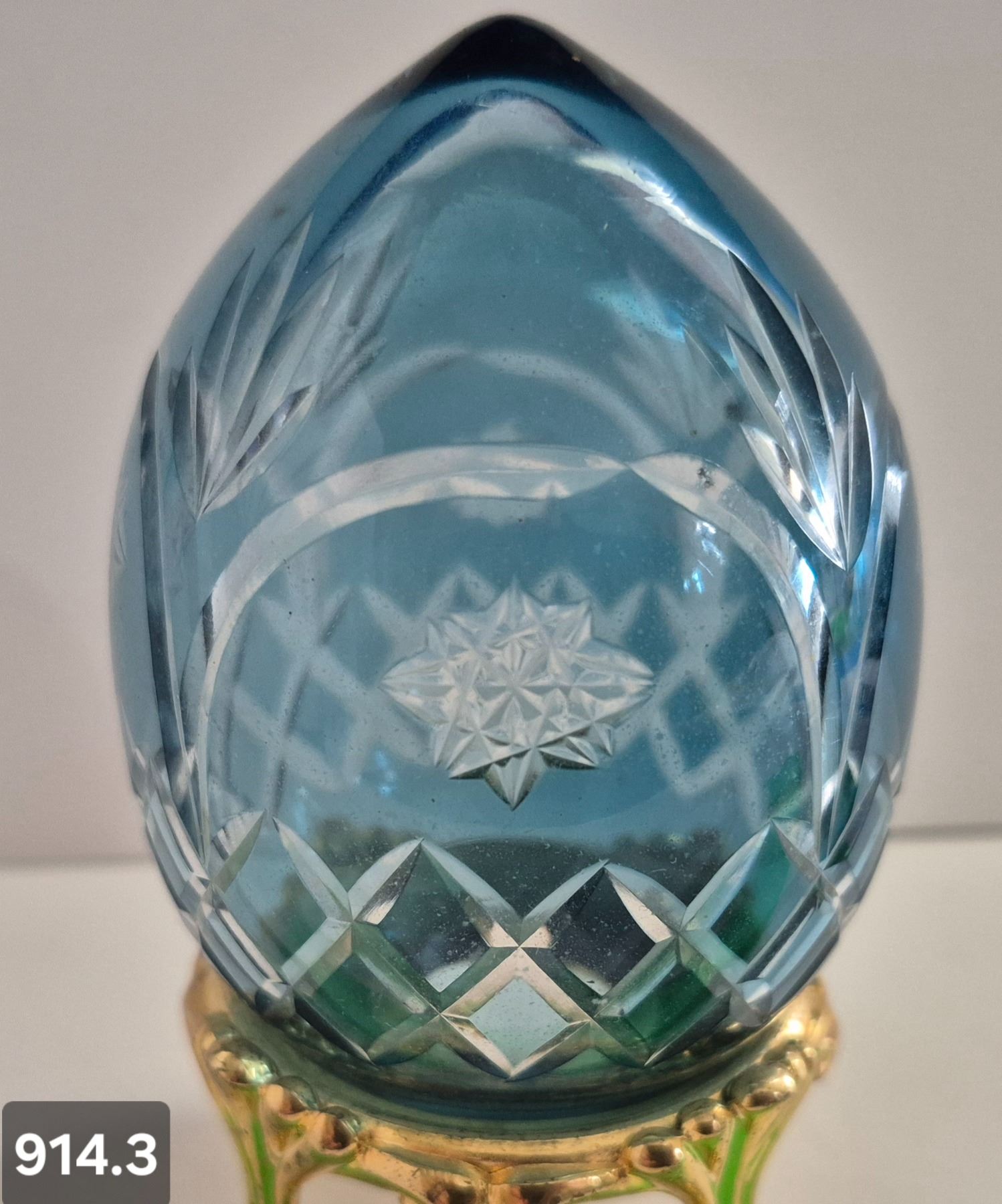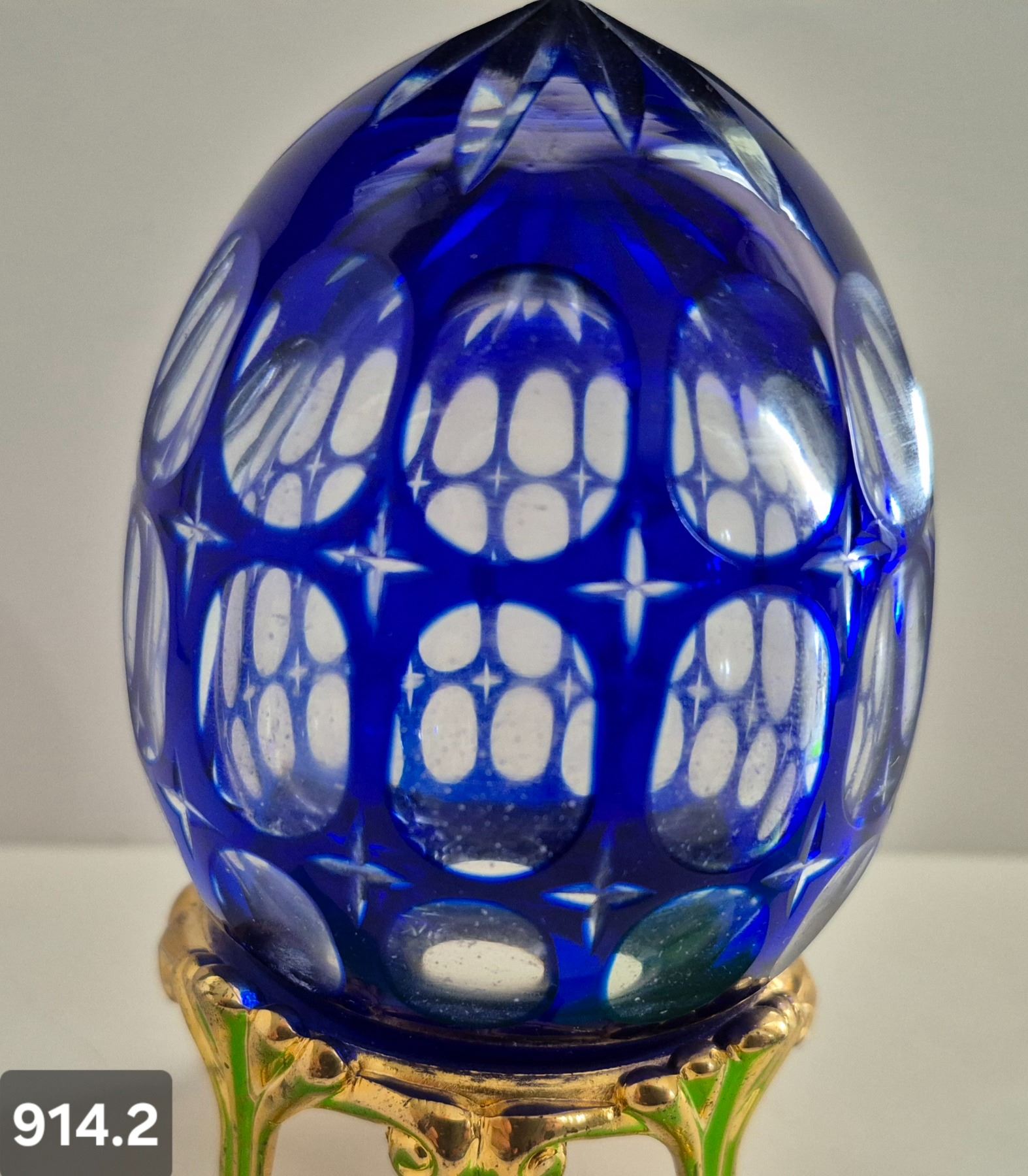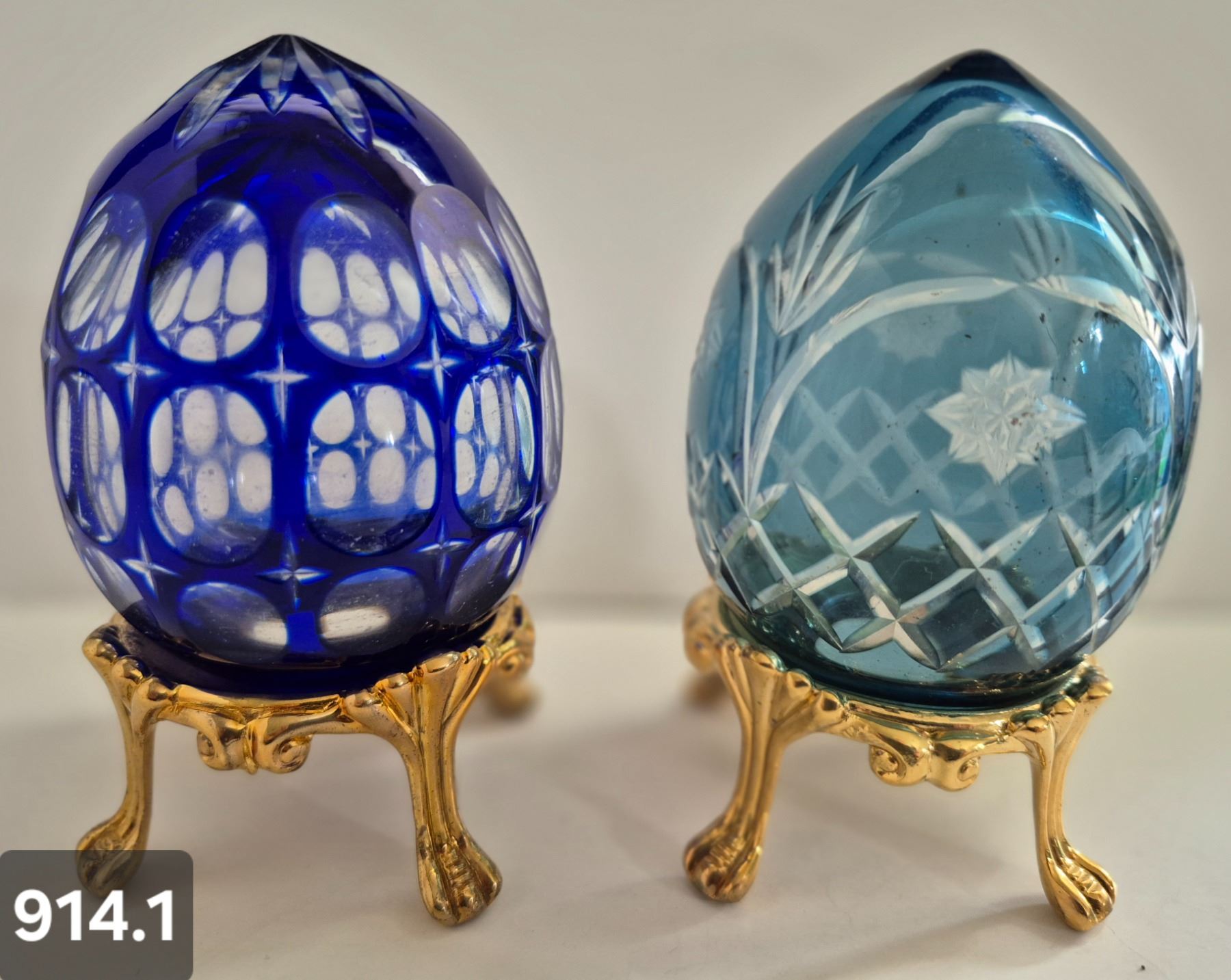 914. Pair of Bohemian cut glass MCM eggs - 24k gold-plated stand, from a large collection
