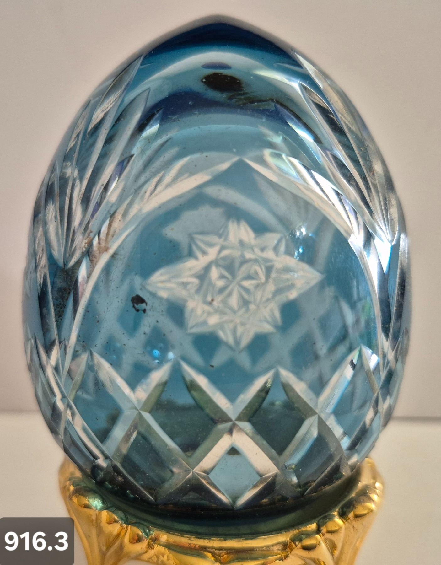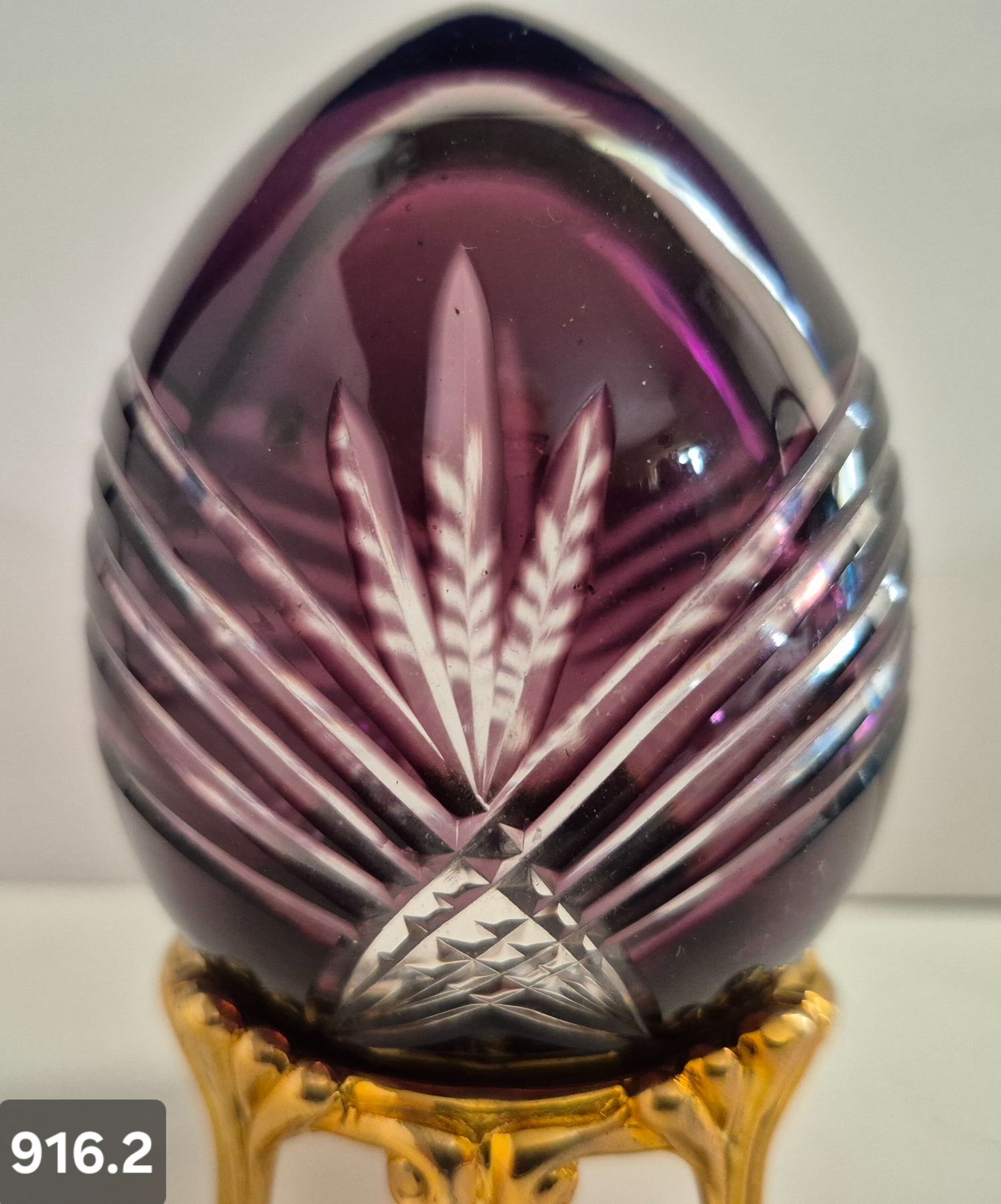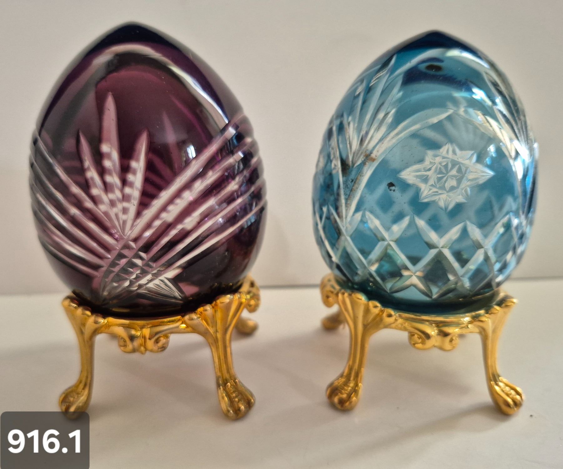 916. Pair of Bohemian cut glass MCM eggs - 24k gold-plated stand, from a large collection