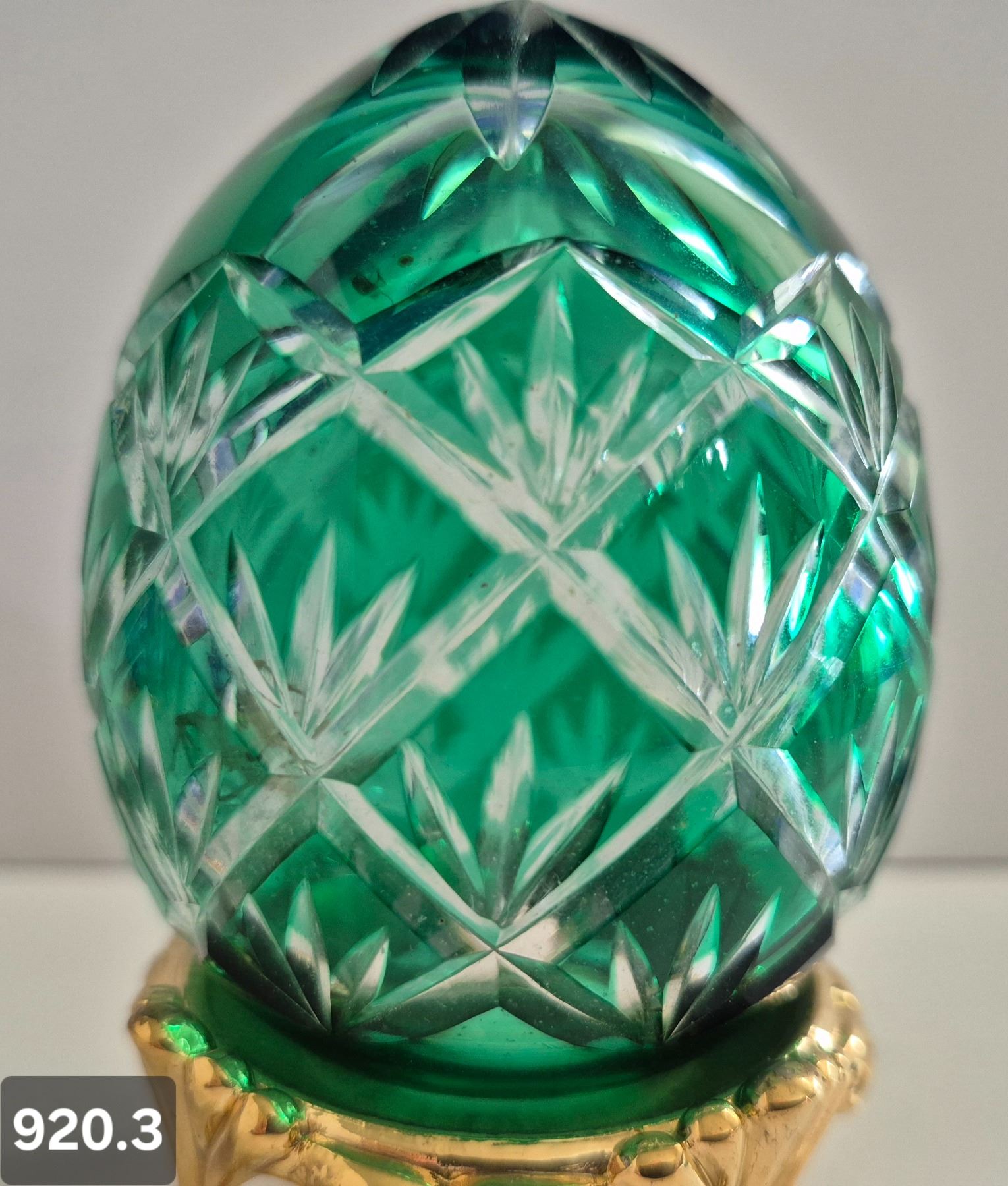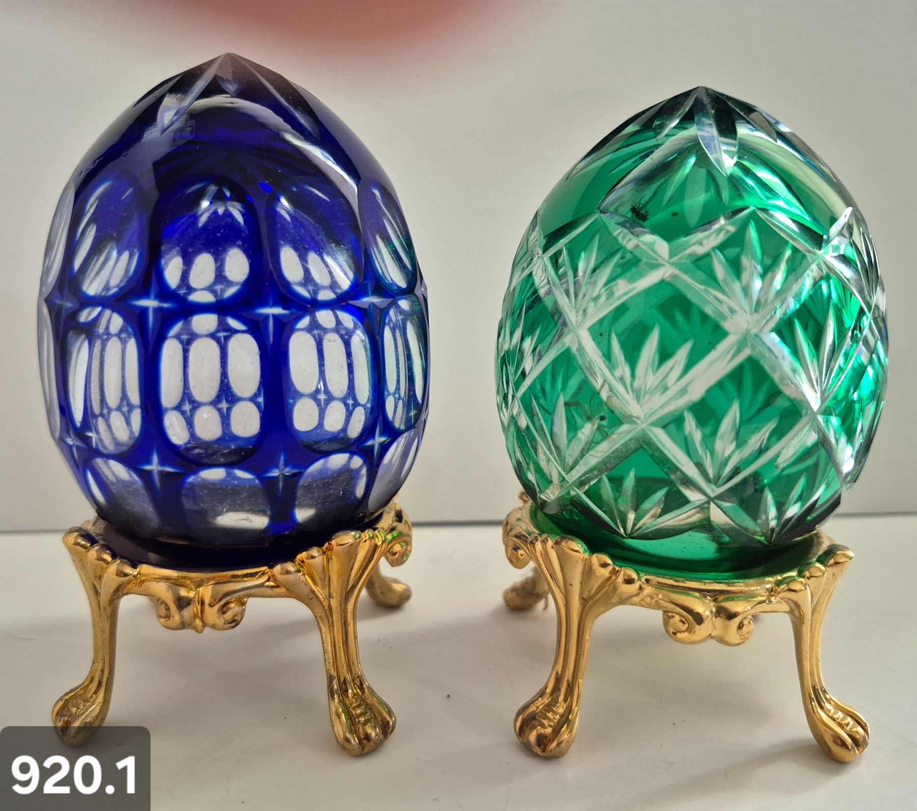 920. Pair of Bohemian cut glass MCM eggs - 24k gold-plated stand, from a large collection