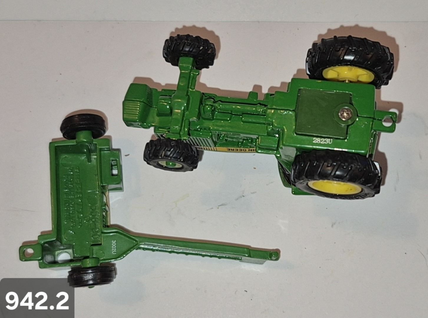 942. John Deere 1/64 tractor with 1 implement - mint condition, from the 80s or 90s. (Diecast Metal)