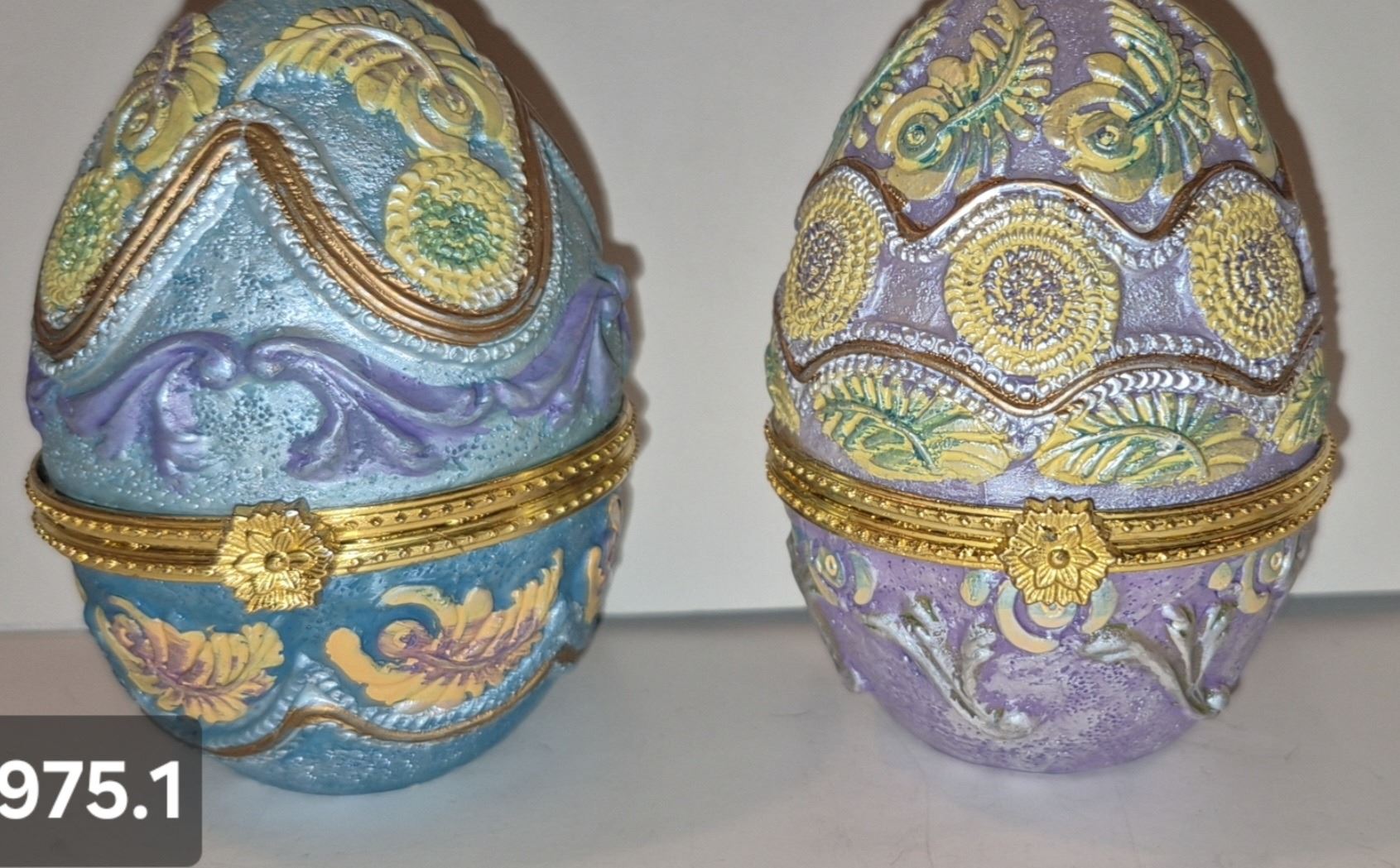 Lot 975 975. Pair of pottery decorated egg trinket boxes, approx. 3 1/2 inches tall