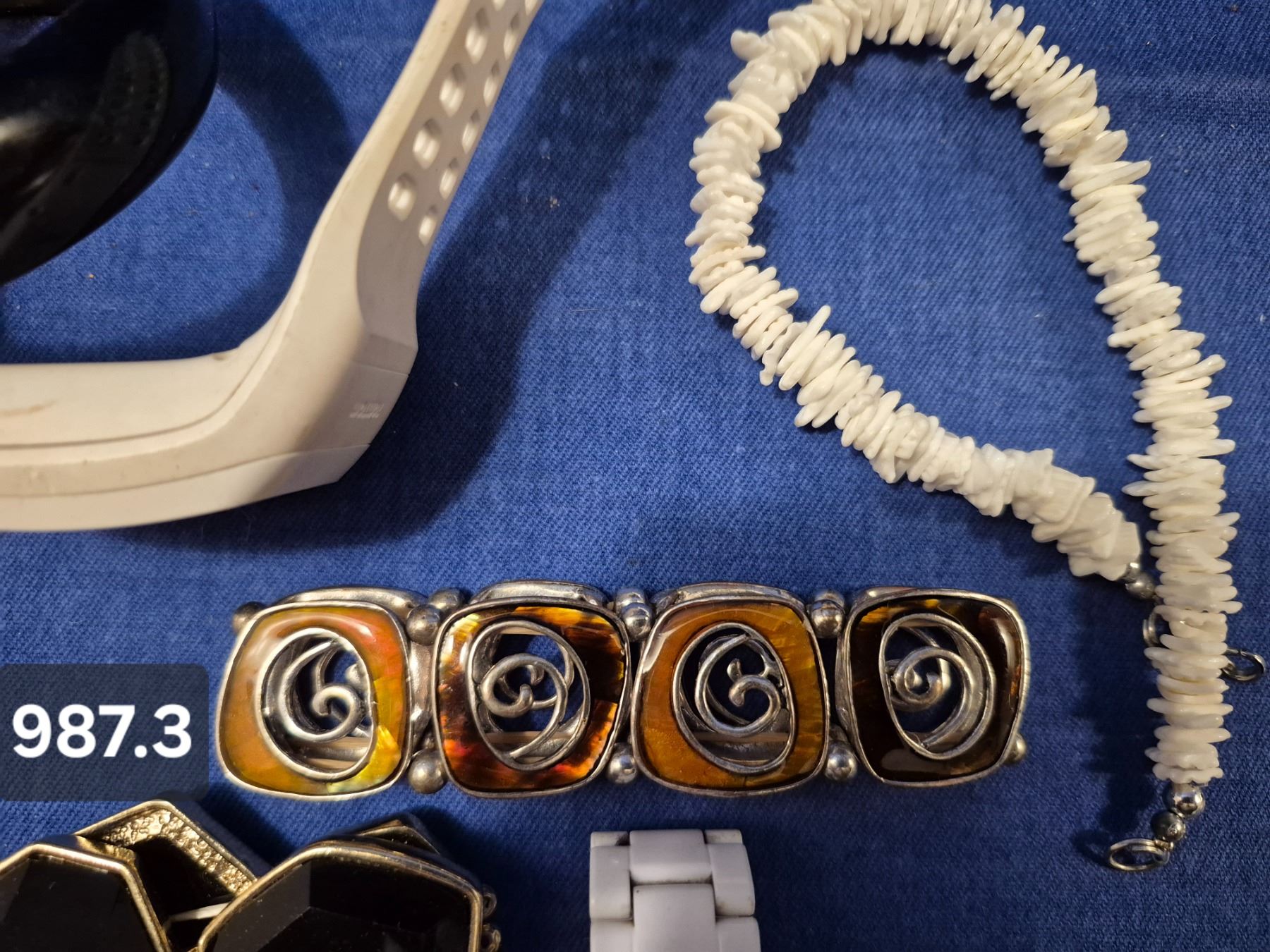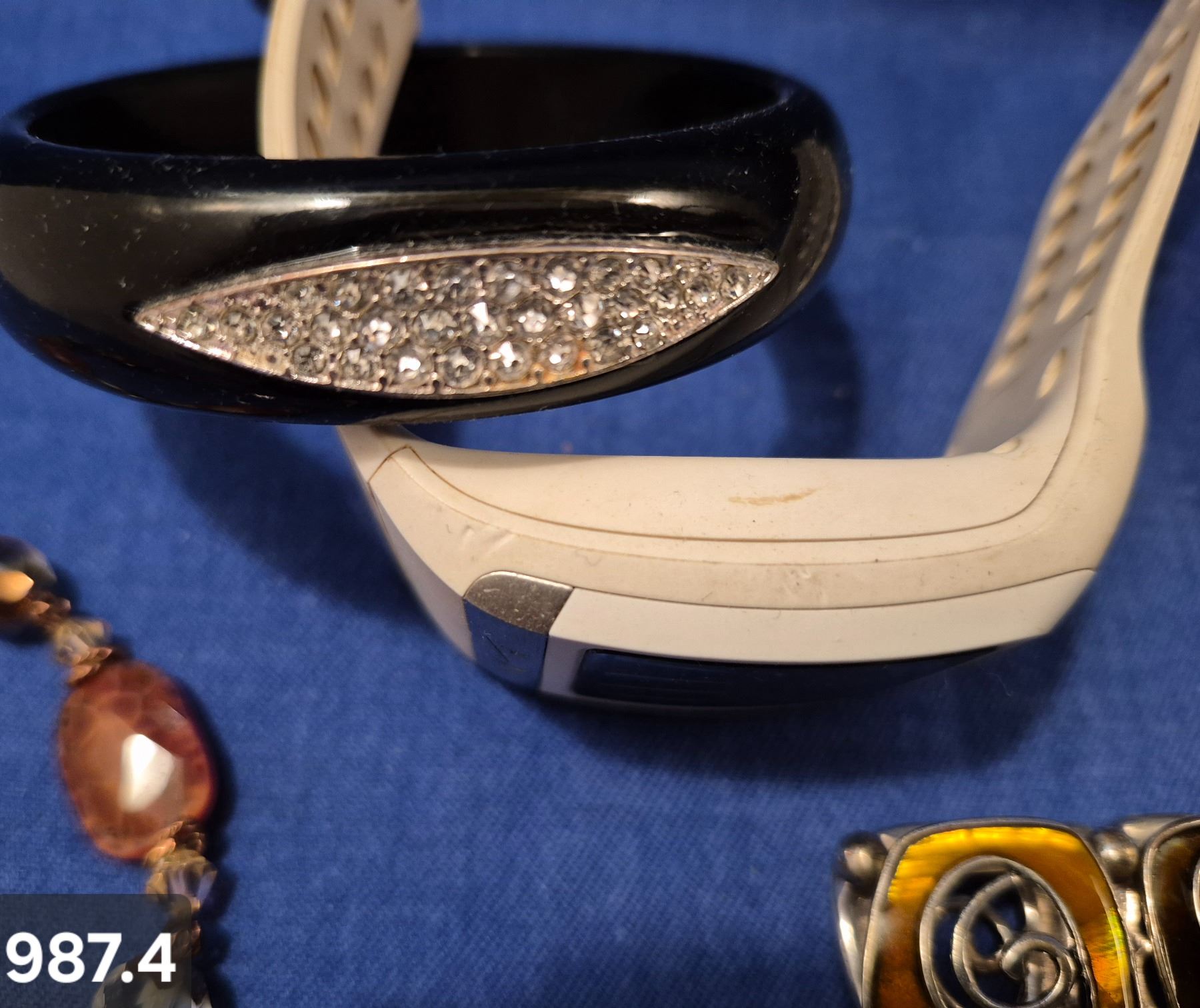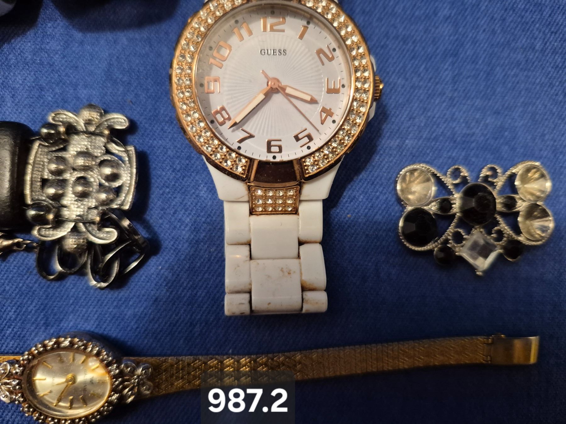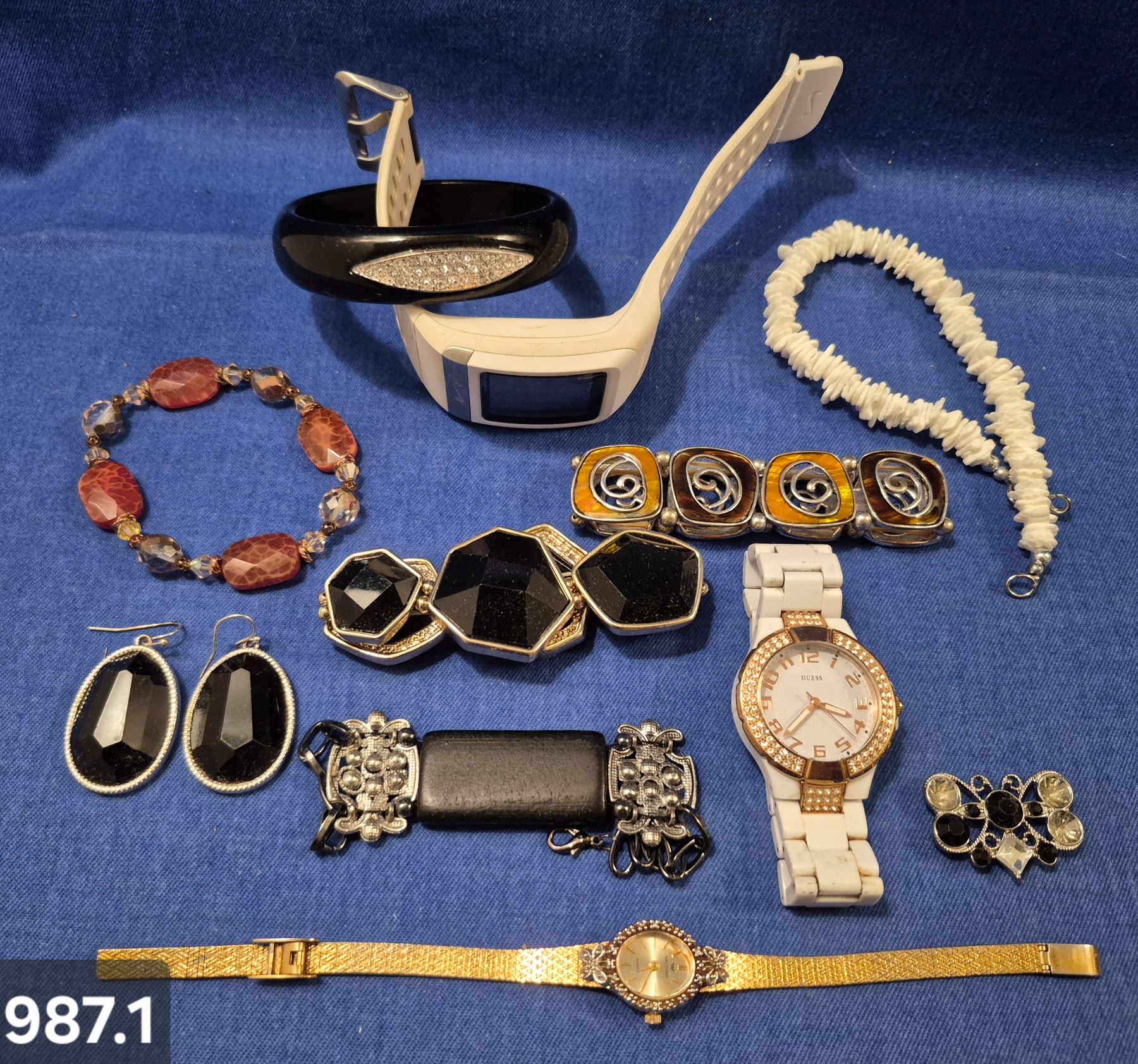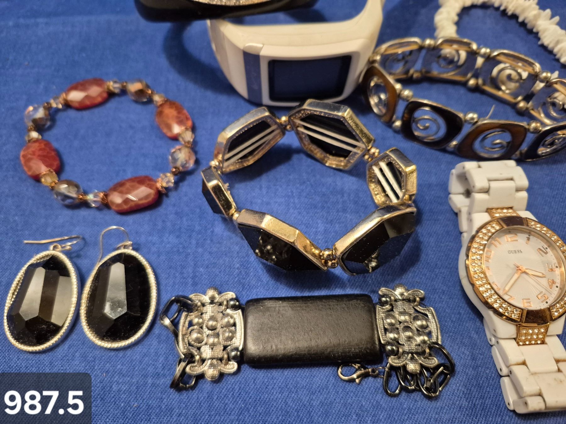 987. Lot of jewelry items, including TomTom watch (working), Guess watch, and other items