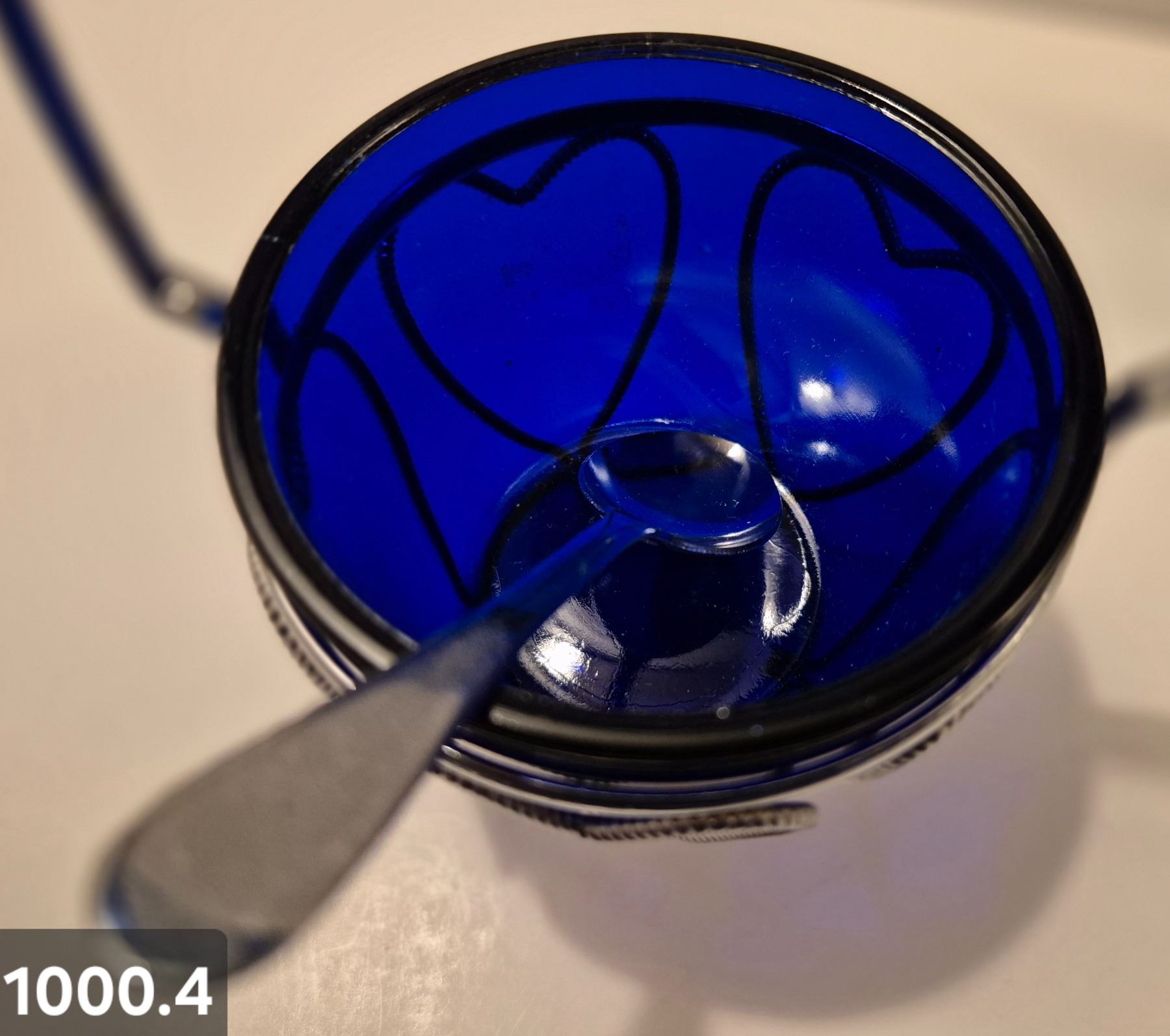 Lot 1000 1000. Pair of cobalt blue items, covered jam jar, chrome accents, and salt and pepper shakers