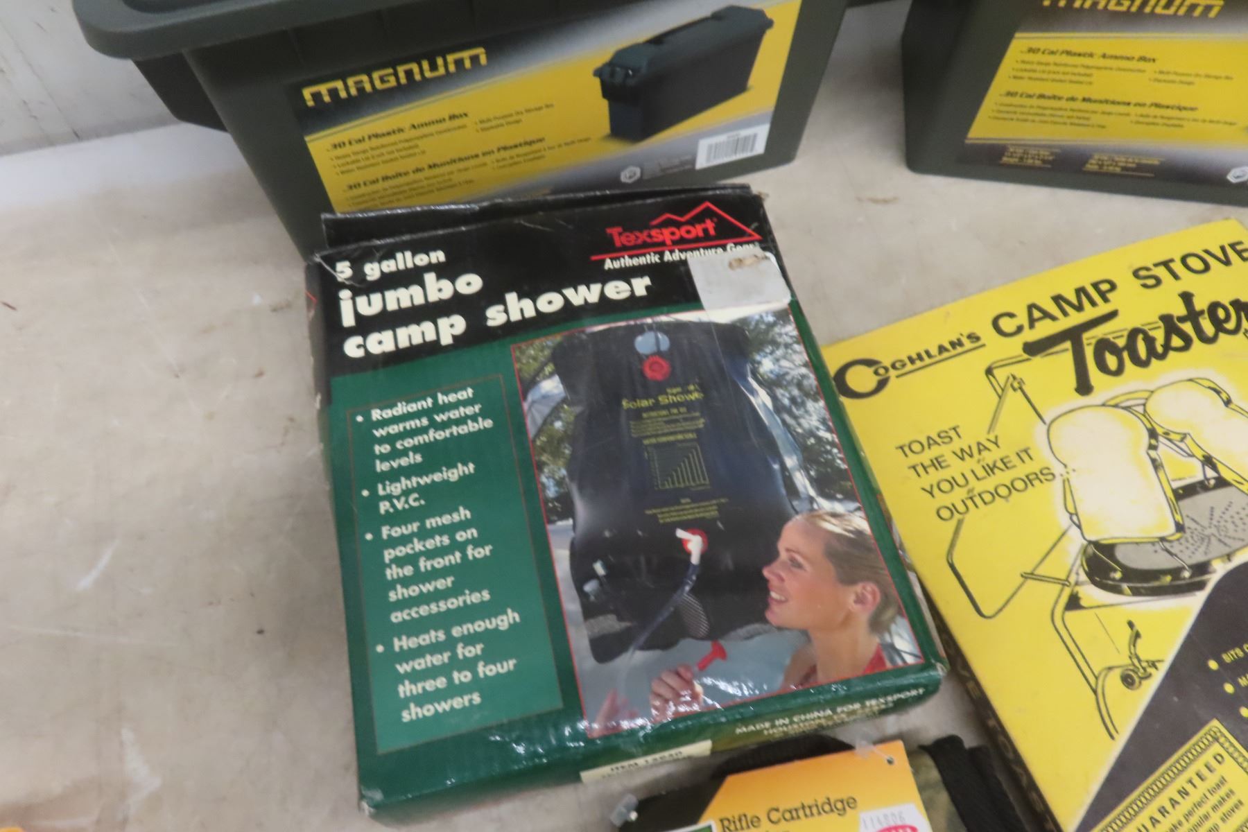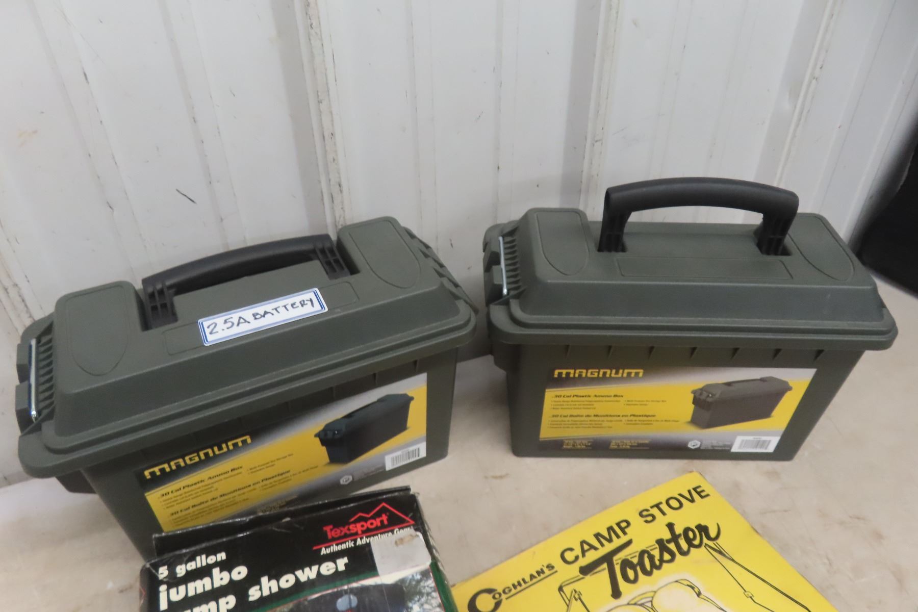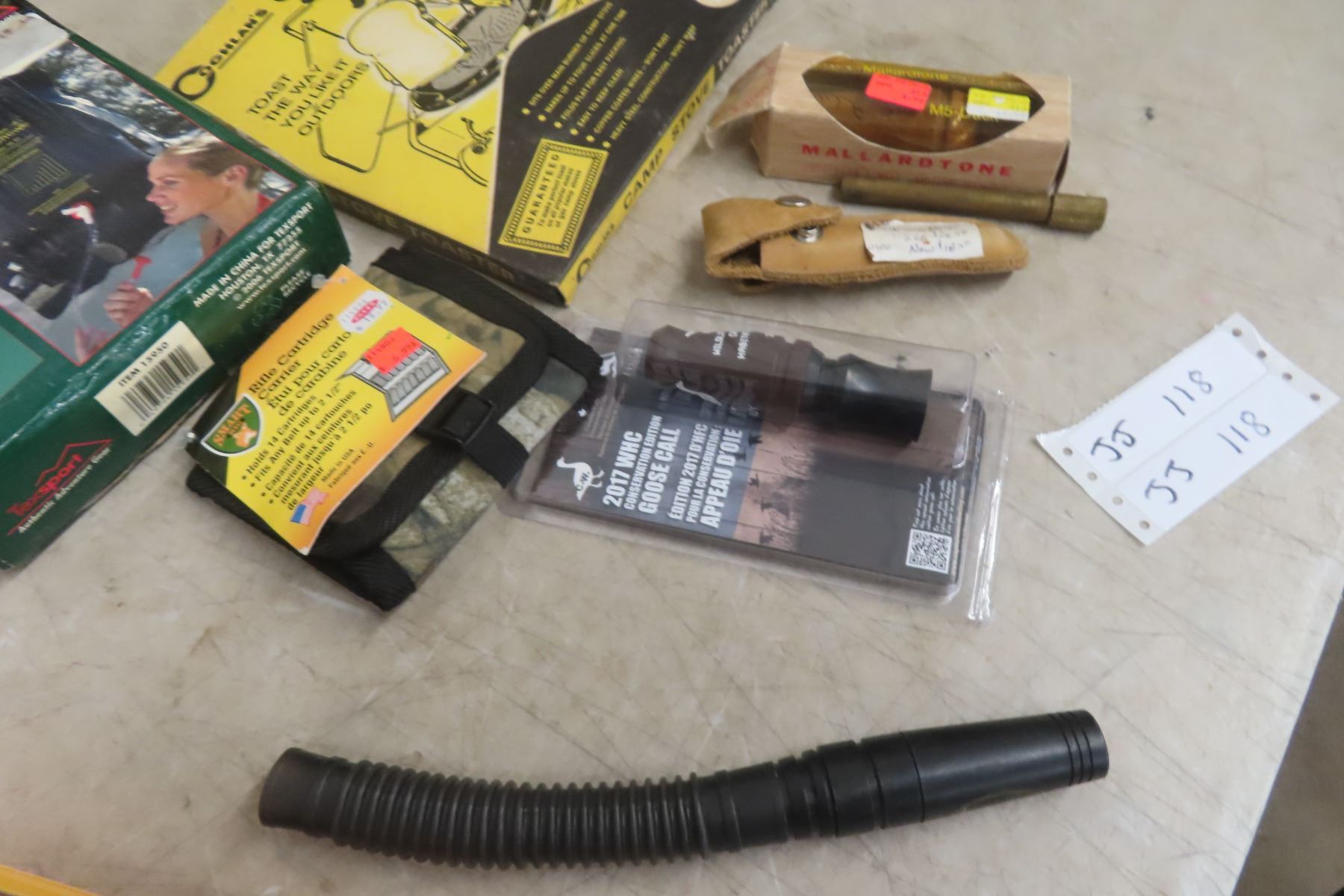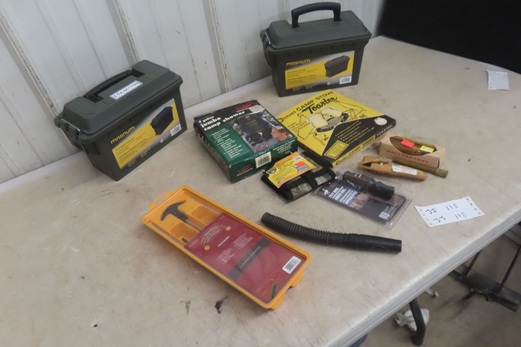 Lot 118 2 Magnum .30 Caliber Ammo Cans, Gun Cleaning Kit, Duck Call, Compass, Torch/Light, and Shovel